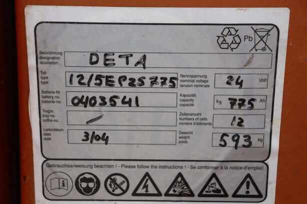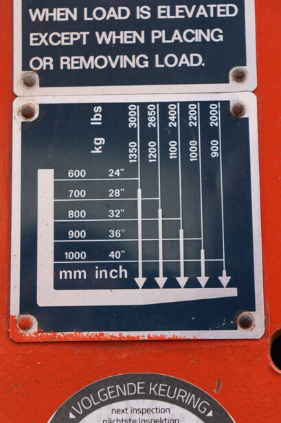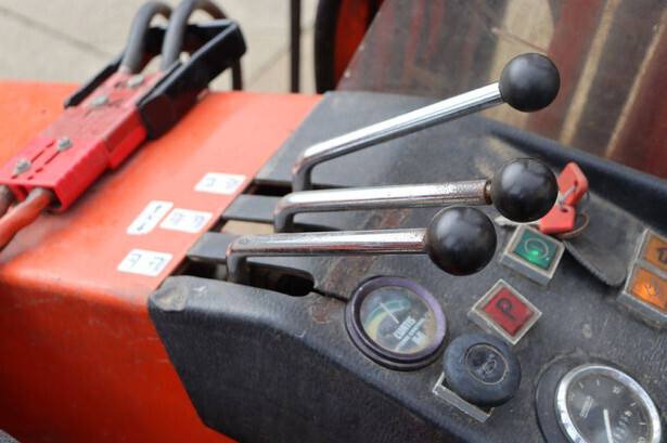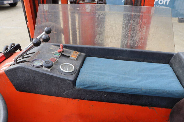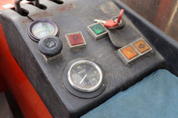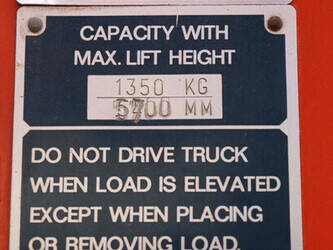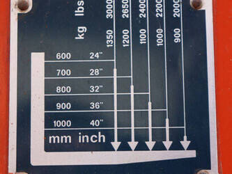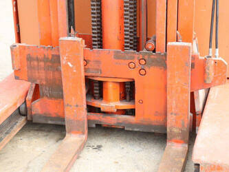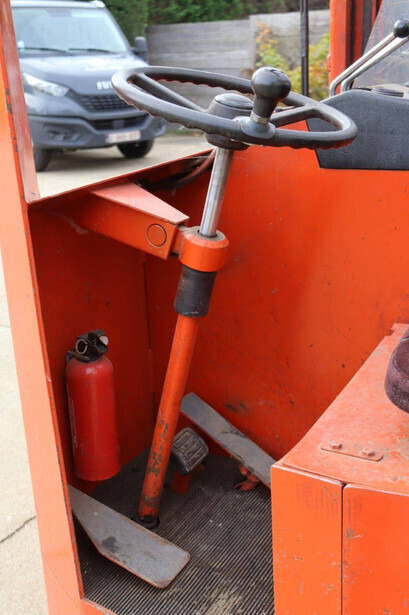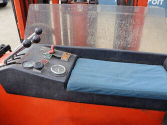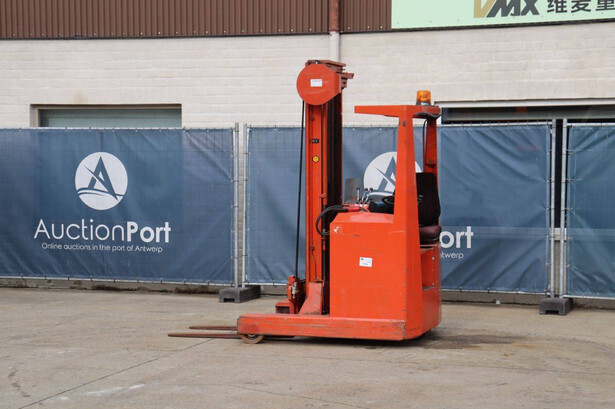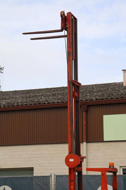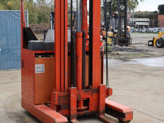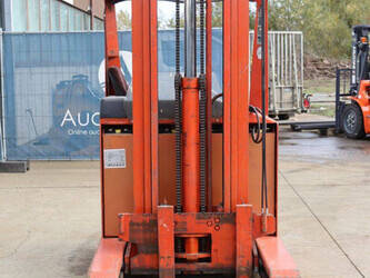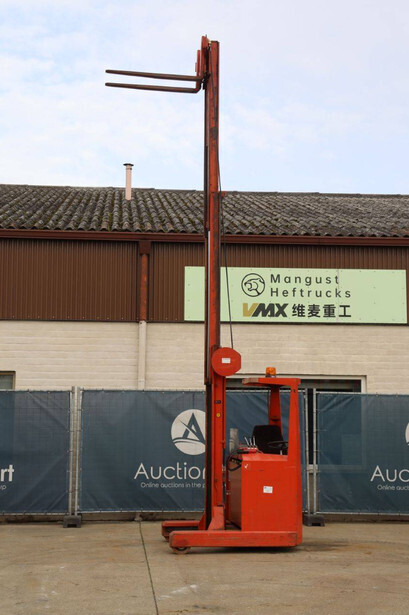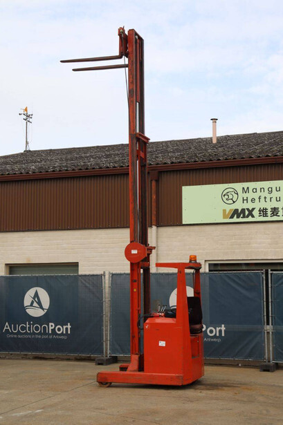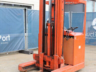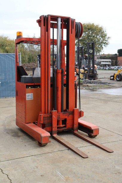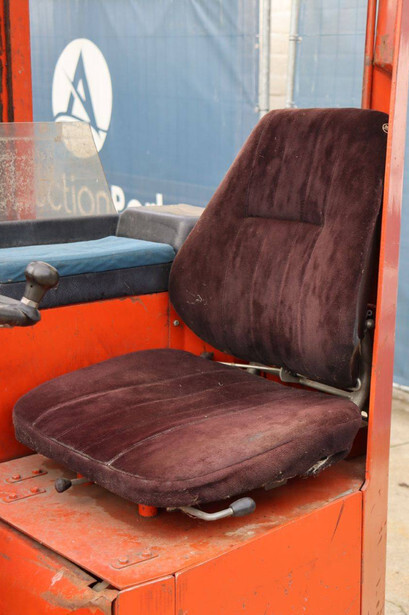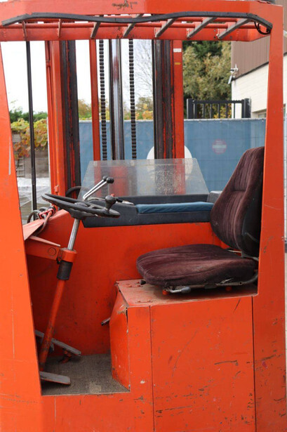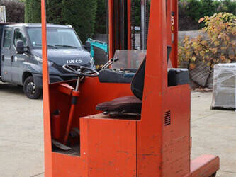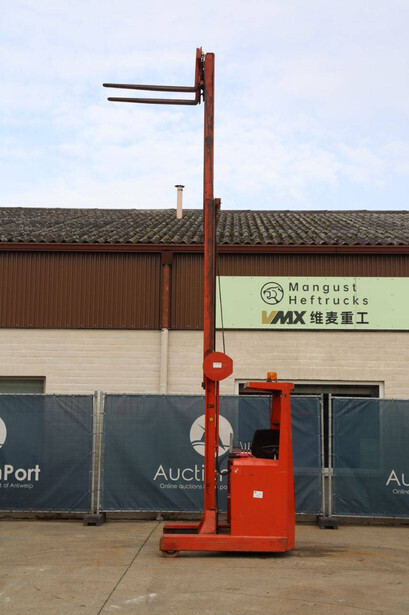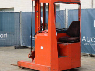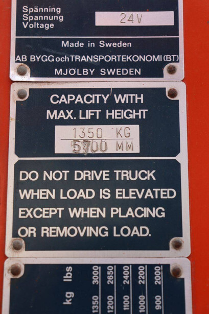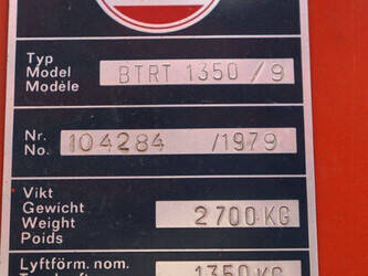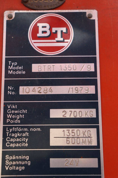 Brand: BT Type: BTRT 1350/9 Serial number: 104284 Year of construction: 1979 Fuel: Electric Mast type: Triplex Sideshift: No Lifting capacity: 1350 kg Lifting height: 5700 mm Operating hours read: 16800 h Machine weight: 3293 kg Color: orange