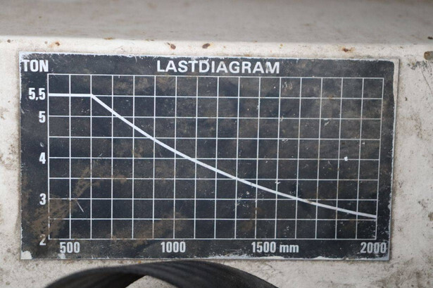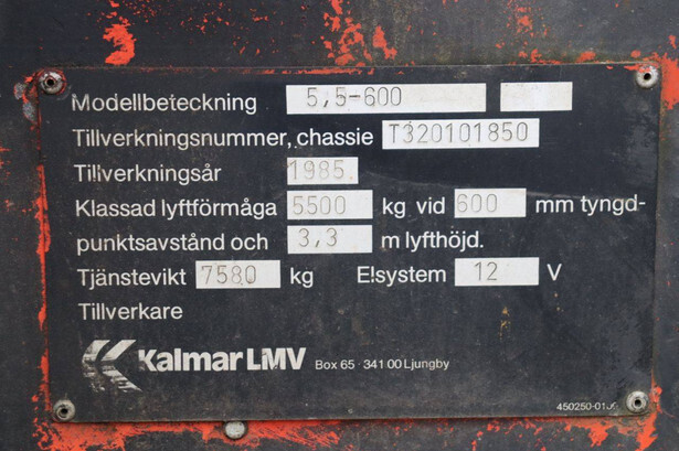 Brand: Kalmar Type: 5.5-600 Serial number: T320101850 Year of construction: 1985 Fuel: Diesel Mast type: Duplex Sideshift: Yes Lifting capacity: 5500 kg Lifting height: 4000 mm Reading operating hours: 10123 h Machine weight: 7580 kg Tires: Solid tires Color: blue