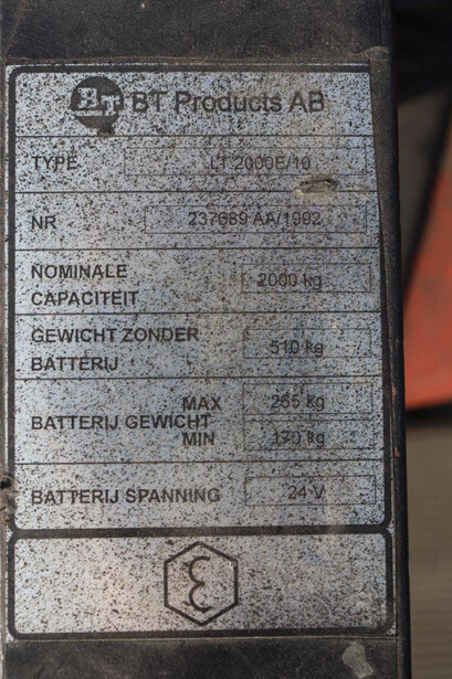 Brand: BT Type: LT-2000E/10 Serial number: 237689 AA Year of construction: 1992 Fuel: Electric Lifting capacity: 2000 kg Machine weight: 775 kg Color: red