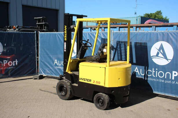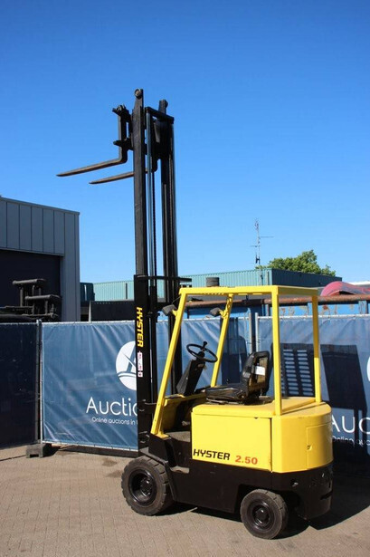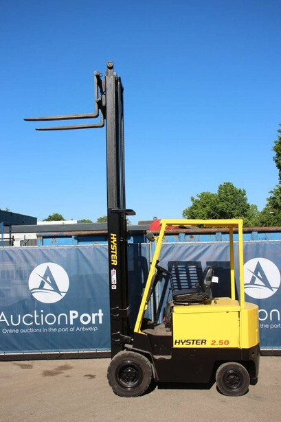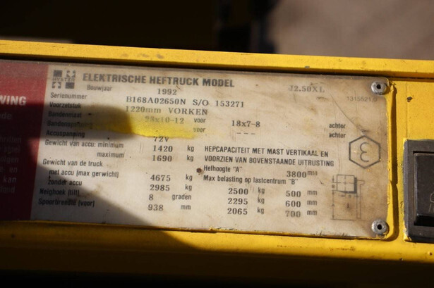 Brand: Hyster Type: J2.50XL Serial number: B168A02650N Year of construction: 1992 Fuel: Electric Mast type: Duplex Sideshift: No Lifting capacity: 2500 kg Lifting height: 3800 mm Operating hours read: 6964 h Machine weight: 4675 kg Tires: Solid tires Color: yellow
