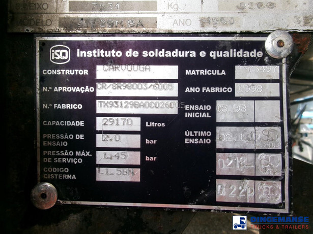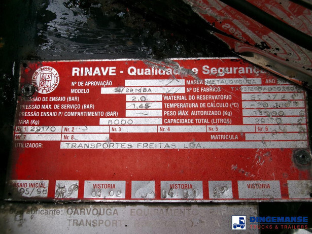 Bitumen tank, Insulated stainless steel, Capacity 29177 liters, 1 Compartment, Test pressure 2.0 bar, Max working pressure 1.45 bar, Air suspension, 1st axle lift axle, Drum brakes, SAF axles, ABS,Shipment dimensions 1100x250x360 cm