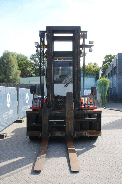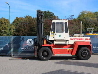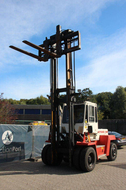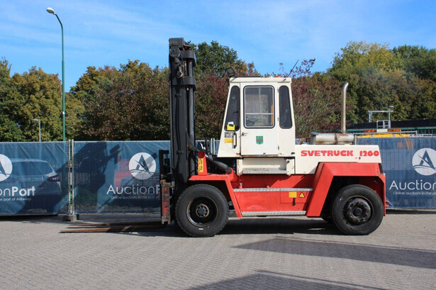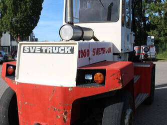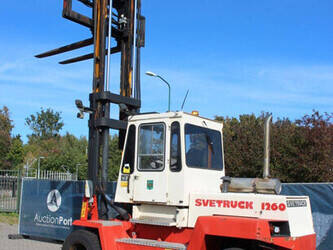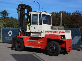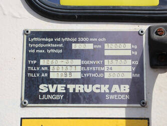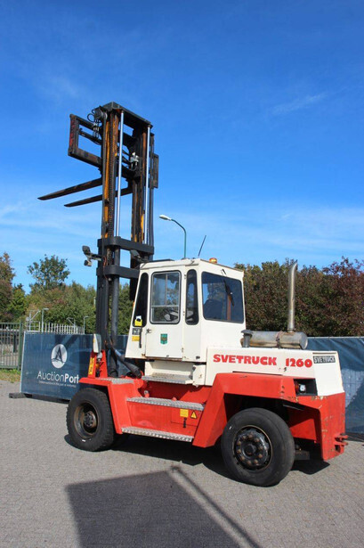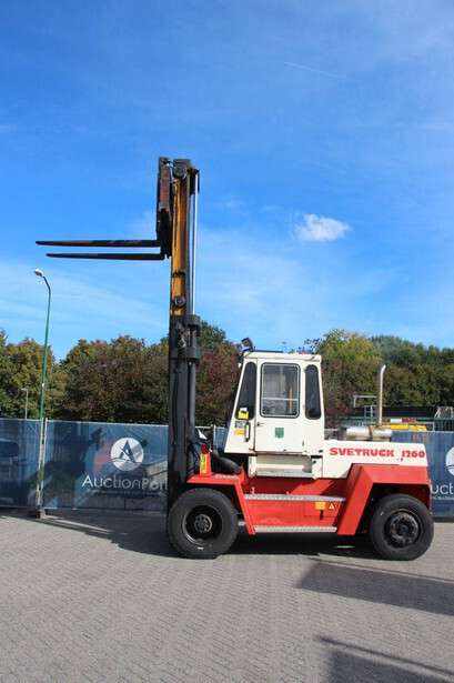 Brand: Svetruck Type: 1260-30 Serial number: 501571 Year of construction: 1999 Fuel: Diesel Mast type: Duplex Sideshift: Yes Lifting capacity: 12000 kg Lifting height: 5000 mm Operating hours read: 60703 h Machine weight: 15700 kg Tires: Pneumatic tires Color: red