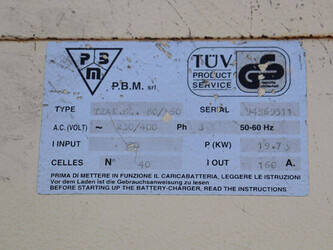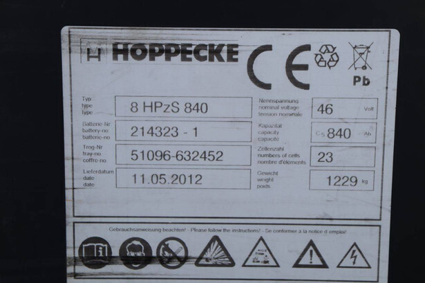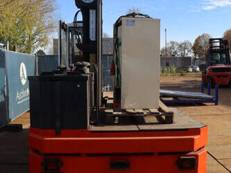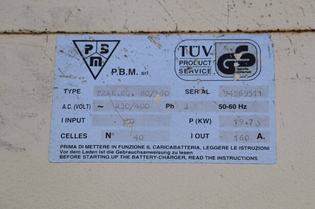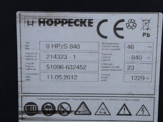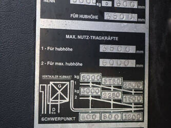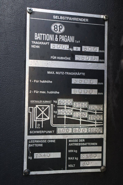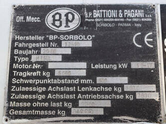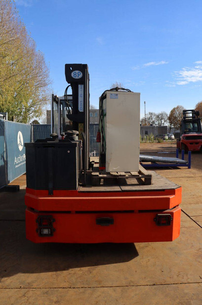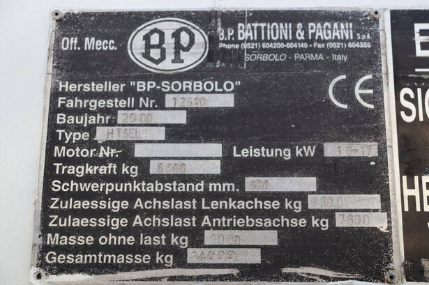 Brand: BPW Type: HT5EL Serial number: 12840 Year of construction: 2000 Fuel: Electric Mast type: Triplex Sideshift: No Lifting capacity: 5000 kg Lifting height: 6000 mm Operating hours read: 10603 h Own weight of machine: 14000 kg Tires: Pneumatic tires Color: orange