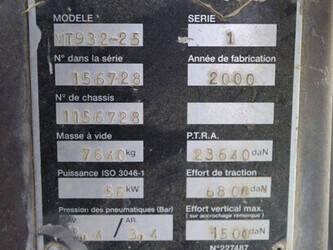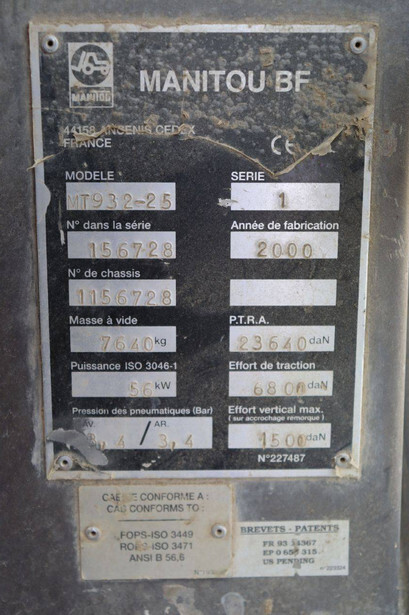 Brand: Manitou Type: MT932-25 Serial number: 156728 Year of construction: 2000 Fuel: Diesel Engine power: 76 HP Engine Brand: Perkins Lifting capacity: 1500 kg Lifting height: 9000 mm Operating hours read: 6592 h Machine weight: 7640 kg Tires: Pneumatic tires Color: red
