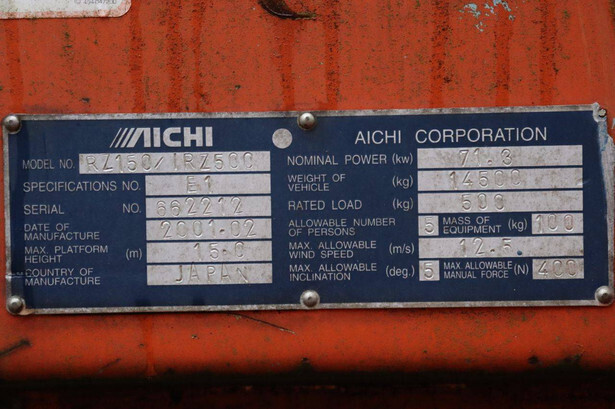 Brand: Aichi Type: RZ150/IRZ500 Serial number: 662212 Year of construction: 2001 Fuel: Diesel Lifting capacity: 500 kg Working height: 17 m Recorded operating hours: 4150 h Machine weight: 14500 kg Undercarriage: Tracks Type: Telescopic boom lift Color: orange
