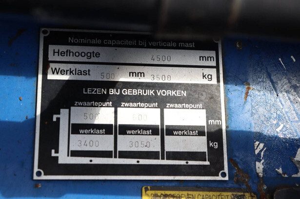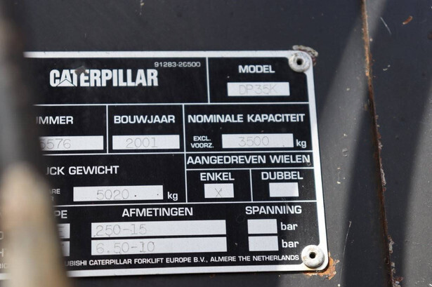 Brand: Caterpillar Type: DP35K Serial number: ET14C-65576 Year of construction: 2001 Fuel: Diesel Mast type: Duplex Sideshift: Yes Lifting capacity: 3500 kg Lifting height: 4500 mm Reading operating hours: 11719 h Machine weight: 5020 kg Tires: Solid tires Color: blue