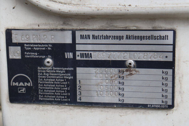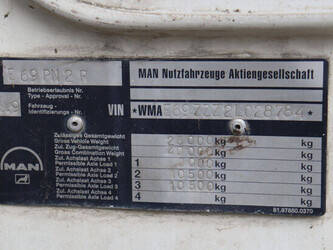 Brand: MAN Model: 33.360 Chassis number: WMAE69ZZZ2L028784 Year of construction: 2002 Fuel: Diesel Engine power: 360 HP Transmission: Manual Odometer reading: 390598 KM Color: white