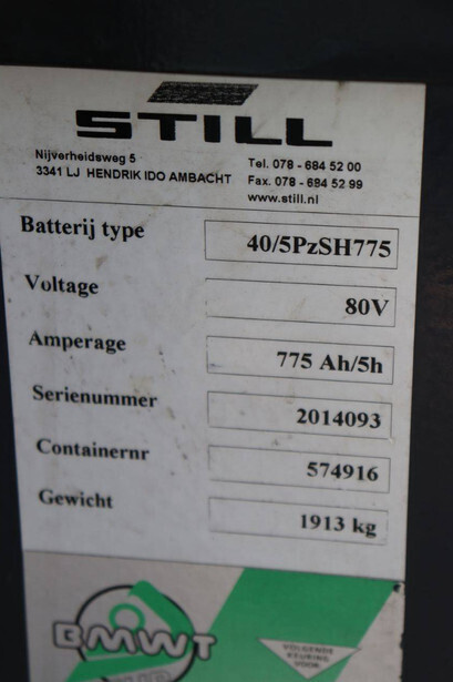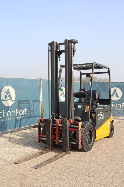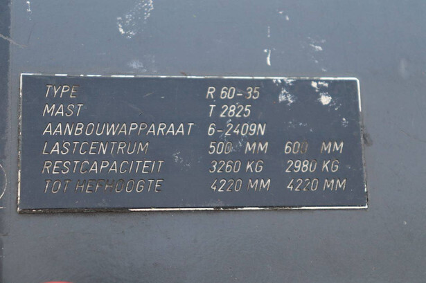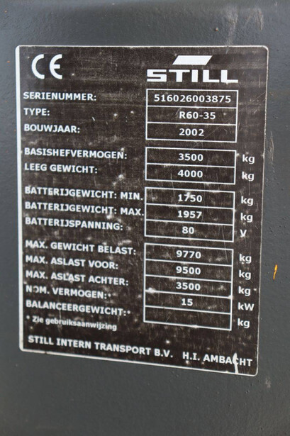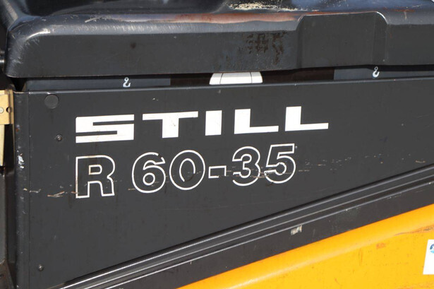 Brand: Still Type: R60-35 Serial number: 516026003875 Year of construction: 2002 Fuel: Electric Mast type: Duplex Sideshift: Yes Lifting capacity: 3500 kg Lifting height: 5020 mm Operating hours read: 10834 h Machine weight: 5957 kg Tires: Solid tires Color: yellow