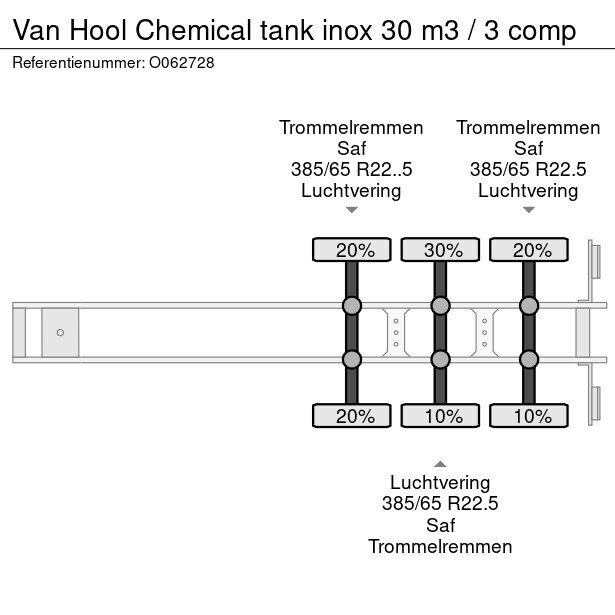 Chemical tank, Insulated stainless steel (inox), Capacity 30,000 litres, 3 Compartments (12000; 6000; 12000), Test pressure 4 bars, Max. working pressure 3 bars, Tank material code 1.4301, ABS, Air suspension, SAF axles, Drum brakes, Front axle lift, Shipment dimensions 1170 x 250 x 360 cm.