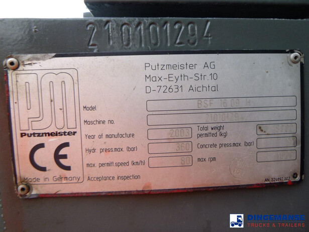 NON DUTY FREE VEHICLE, REQUIRES CUSTOMS CLEARANCE // Putzmeister BSF 16.09 H concrete boom, 16 meters vertical reach, Year of construction 2003, Max concrete pressure 71 bar, Radio control, Cable control, 4 support legs, Truck 4x2, Euro 3, Manual gearbox with 12 gears, Full steel suspension, Day cabin, Analogue tachometer, Shipment dimensions 840x255x390 cm