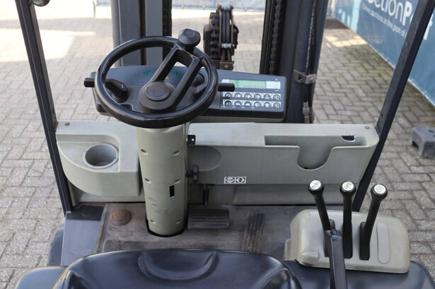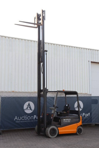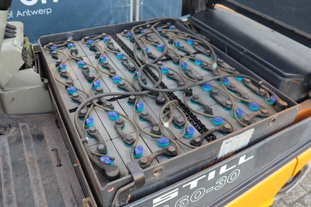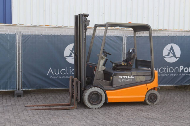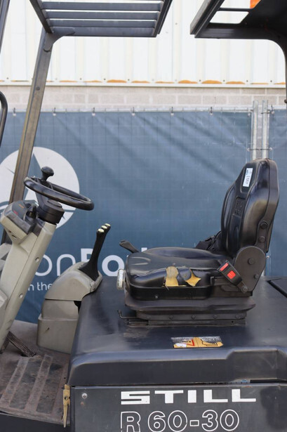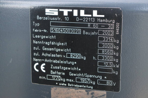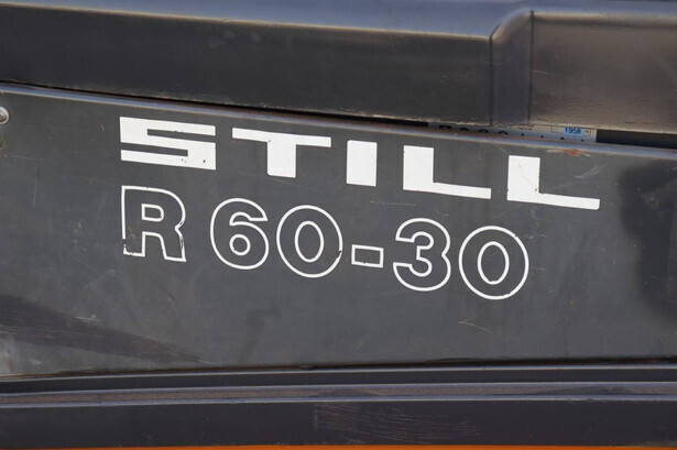 Brand: Still Type: R60-30 Serial number: 516045003020 Year of construction: 2003 Fuel: Electric Mast type: Triplex Sideshift: Yes Lifting capacity: 3000 kg Operating hours read: 3050 h Machine weight: 5271 kg Tires: Solid tires Color: orange