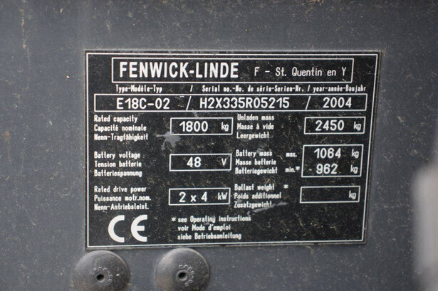 Brand: Linde Type: E18C-02 Serial number: H2X335R05215 Year of construction: 2004 Fuel: Electric Mast type: Not known Sideshift: Yes Lifting capacity: 1800 kg Lifting height: Not known Recorded operating hours: 8580 h Tires: Solid tires Color: black