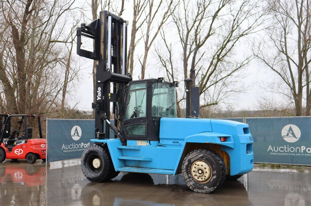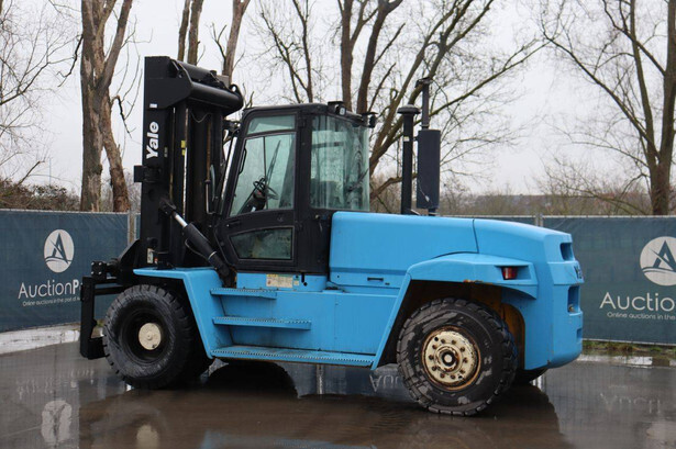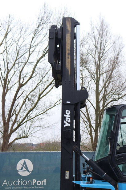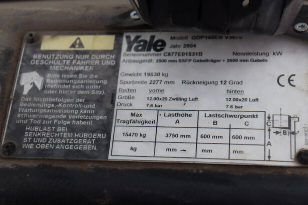 Brand: Yale Type: GDP160EB Serial number: C877E01531B Year of construction: 2004 Fuel: Diesel Mast type: Duplex Sideshift: Yes Lifting capacity: 15470 kg Lifting height: 3750 mm Operating hours read: 4708 h Machine weight: 19530 kg Tires: Solid tires Color: blue