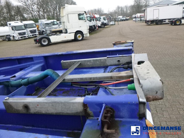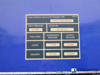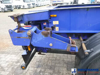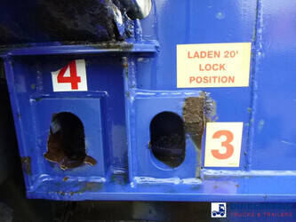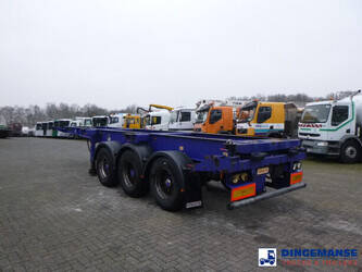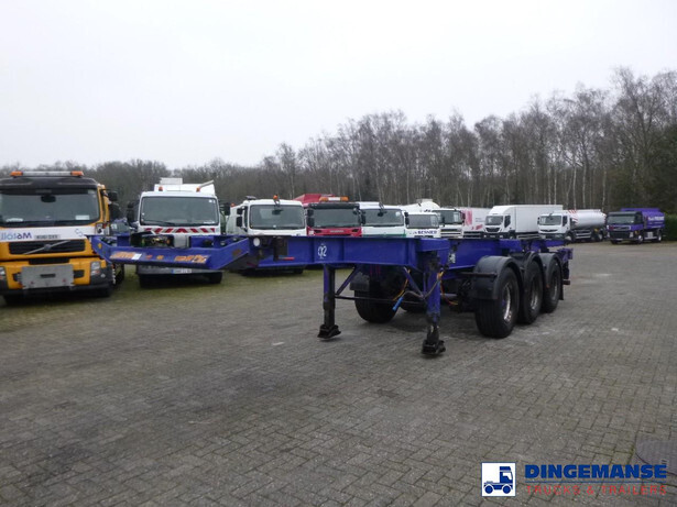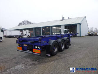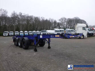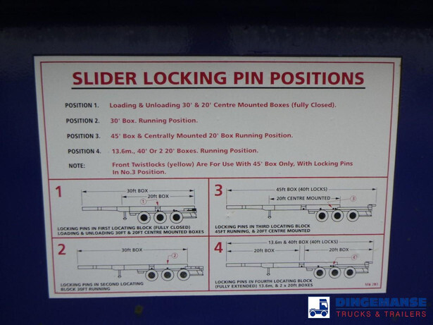 3-axle sliding container trailer, Suitable for 2 x 20 ft, 1 x 30 ft, 1 x 40 ft and 1 x 45 ft containers, Floor height 145 cm, ABS, Air suspension, ROR axles, Disc brakes, Tyres 385/65R22.5, Shipment dimensions 950x250x145 cm