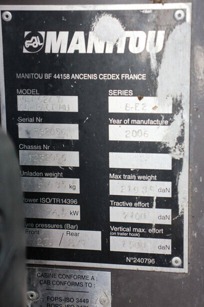 Brand: Manitou Type: MLT 627 T Serial number: 232056 Year of construction: 2006 Fuel: Diesel Engine power: 74.0 kW Lifting capacity: 2700 kg Lifting height: 6000 mm Operating hours read: 5177 h Machine weight: 5935 kg Tires: Pneumatic tires Color: red