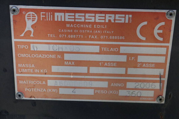 Brand: Messersi Type: TCH-05 Serial number: A6000609 Year of construction: 2006 Fuel: Gasoline Engine power: 4 kW Load capacity: 500 kg Machine weight: 360 kg Running gear: Tracks Color: blue