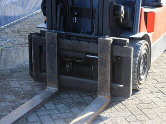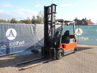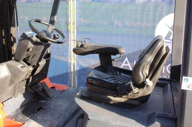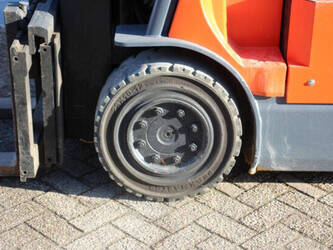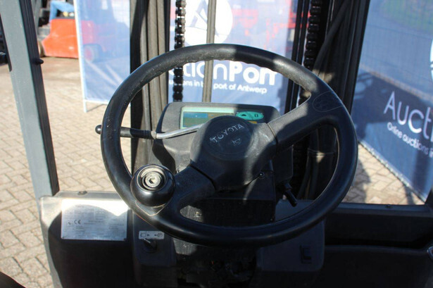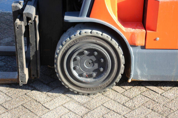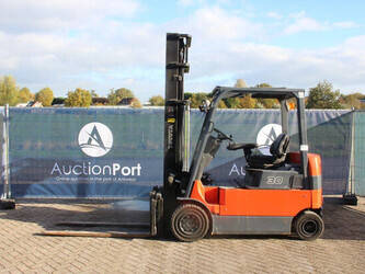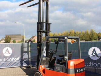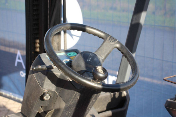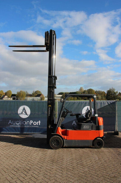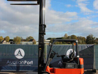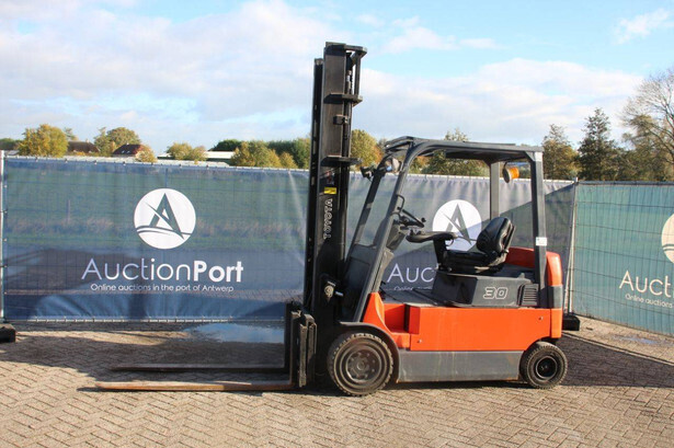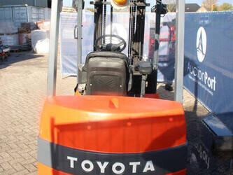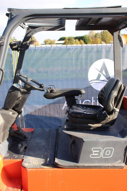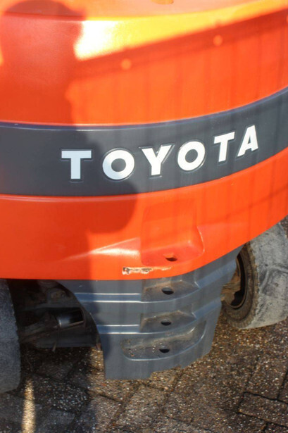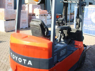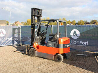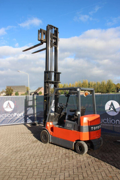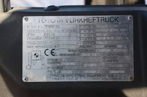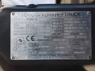 Brand: Toyota Type: 7FBMF30 Serial number: 7FBMF35-910512 Year of construction: 2006 Fuel: Electric Mast type: Duplex Sideshift: Yes Lifting capacity: 3000 kg Lifting height: 4300 mm Operating hours read: 4222 h Machine weight: 5640 kg Tires: Solid tires Color: orange