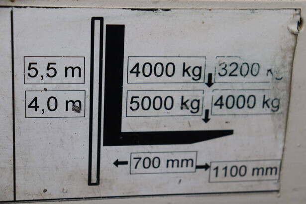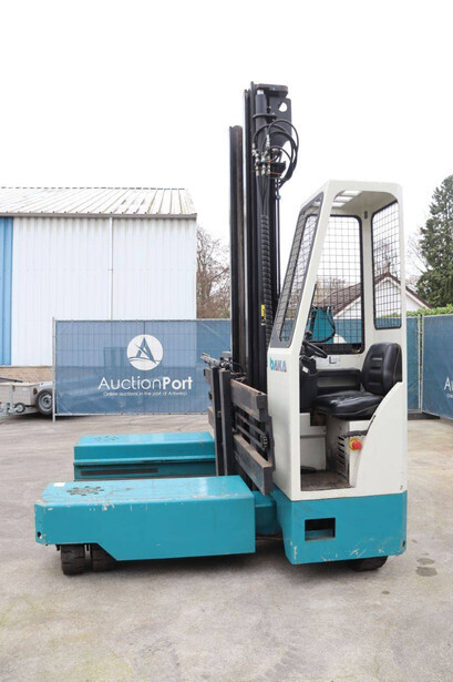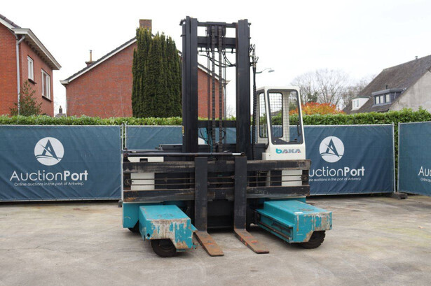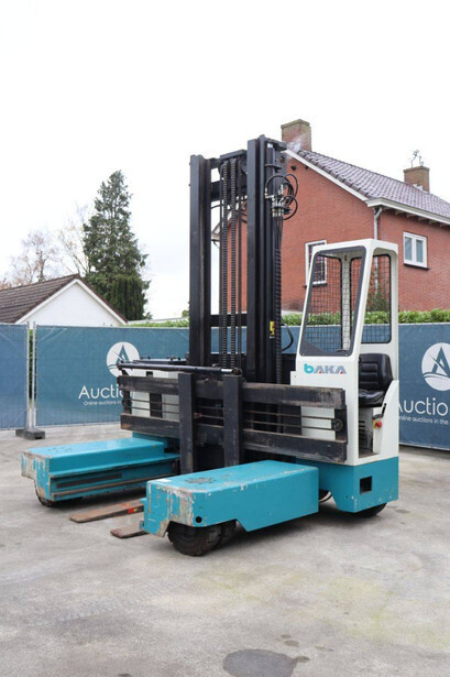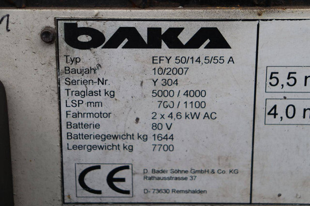 Brand: Baka Type: EFY 50/14.5/55 A Serial number: Y 304 Year of construction: 2007 Fuel: Electric Mast type: Duplex Sideshift: Yes Lifting capacity: 5000 kg Lifting height: 5500 mm Operating hours read: 7417 h Machine weight: 9344 kg Tires: Solid tires Color: blue