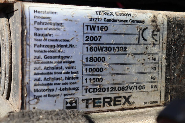 Brand: Terex Type: TW160 Serial number: 160W301392 Year of construction: 2007 Fuel: Diesel Engine power: 105.0 kW Quick change: Yes Operating hours read: 16006 h Own weight of machine: 18000 kg Chassis: Wheels Color: orange