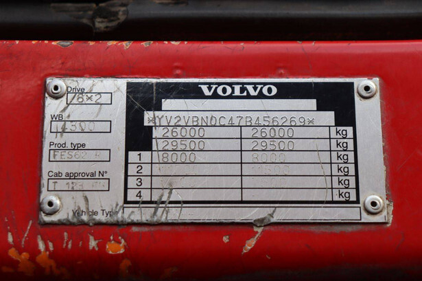 Brand: Volvo Model: FE S 6X2 R Chassis number: YV2VN0C47B456269 Year of construction: 2007 Fuel: Diesel Engine power: 320 HP Transmission: Manual Number of cylinders: Not known Odometer reading: 590646 KM Color: red