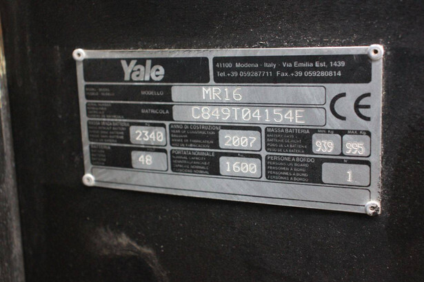 Brand: Yale Type: MR16 Serial number: C849T04154E Year of construction: 2007 Fuel: Electric Mast type: Triplex Sideshift: Yes Lifting capacity: 1600 kg Lifting height: 5500 mm Machine weight: 3335 kg Color: yellow