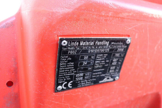 Brand: Linde Type: P60Z Serial number: G1X1126T00125 Year of construction: 2008 Fuel: Electric Recorded operating hours: 417 h Tires: Solid tires Color: red