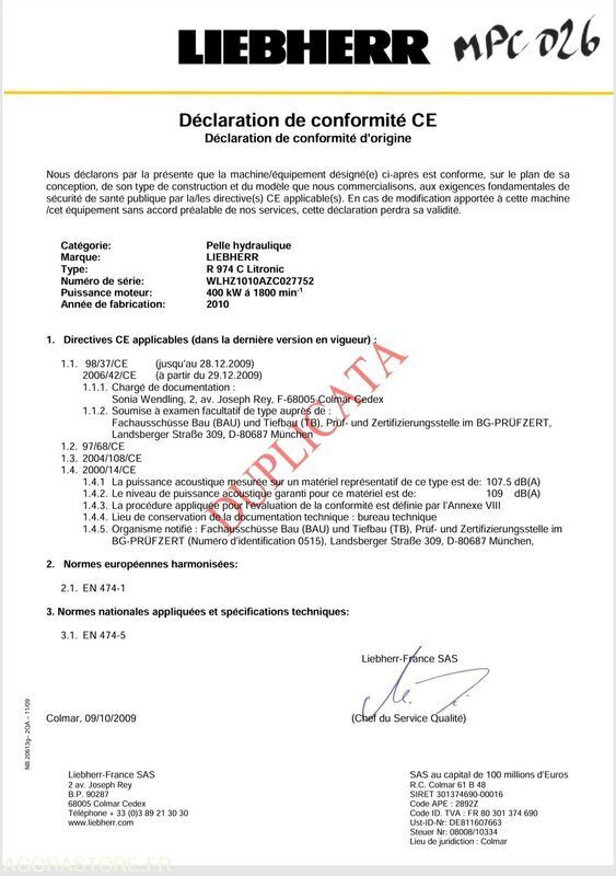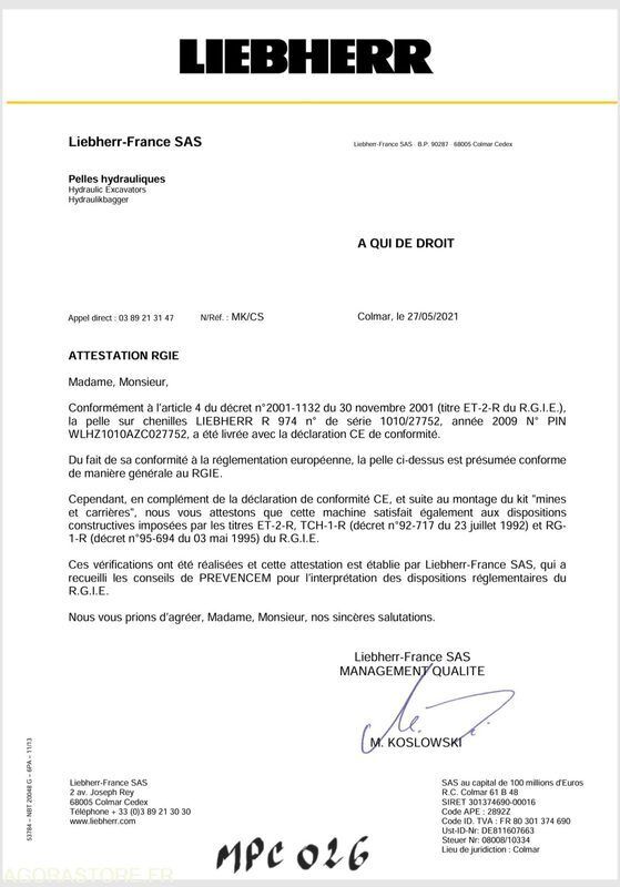 Liebherr R974C Fuel: diesel FR: Type de véhicule PELLE A CHENILLE CE: OUI poids net à vide: 88900 Matériel en état de fonctionnement Le rapport d'inspection est disponible en pièce jointe Moteur changé à 5 000h Fleche monobloc 7,2m et balancier 2,90m godet de terrassement 6m3 Remplacement COLLECTEUR ECHAP + REGLAGES CULBUTEURS en juin 2024 Ref No:TY48983 VIN: WLHZ1010AZC027752