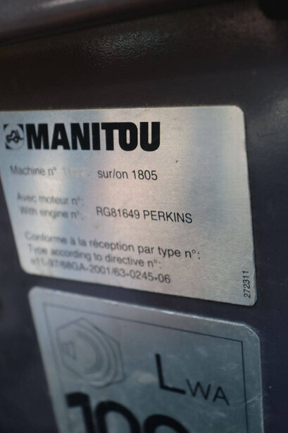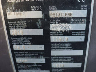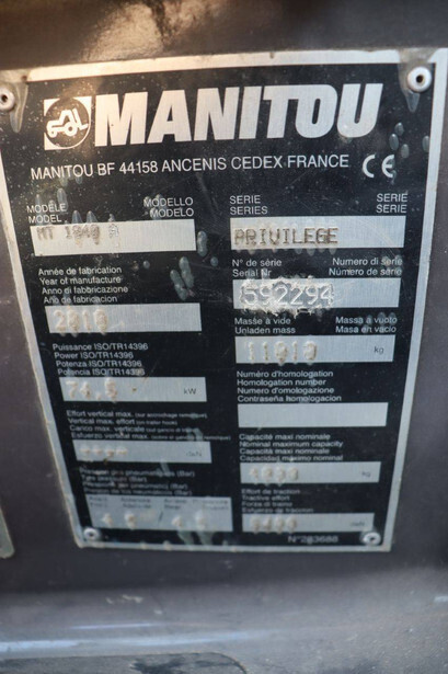 Brand: Manitou Type: MT1840A Serial number: 592294 Year of construction: 2010 Fuel: Diesel Engine power: 101 HP Engine Brand: Perkins Lifting capacity: 4000 kg Lifting height: 18 mm Operating hours read: 4237 h Machine weight: 11010 kg Tires: Pneumatic tires Color: red