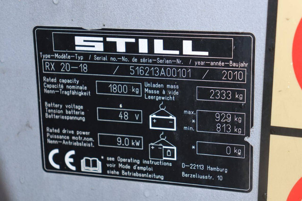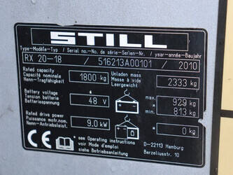 Brand: Still Type: RX20-18 Serial number: 516213A00101 Year of construction: 2010 Fuel: Electric Mast type: Triplex Sideshift: Yes Lifting capacity: 1800 kg Lifting height: 5000 mm Operating hours read: 8740 h Machine weight: 3262 kg Tires: Solid tires Color: orange