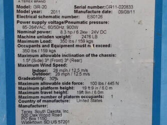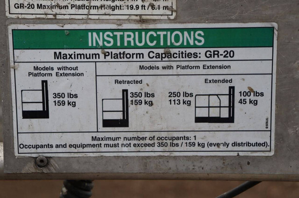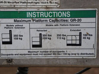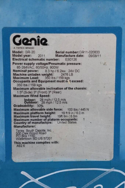 Brand: Genie Type: GR20 Serial number: GR11020833 Year of construction: 2011 Fuel: Electric Lifting capacity: 159 kg Working height: 8 m Machine weight: 1123 kg Chassis: Wheels Type: Mast lift Tires: Non-marking tires Color: blue