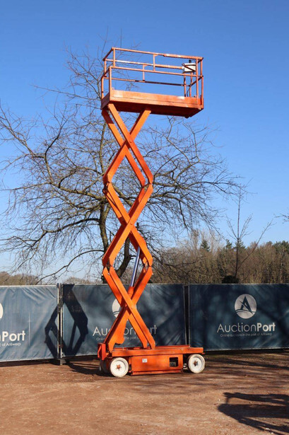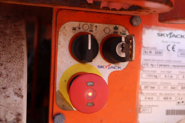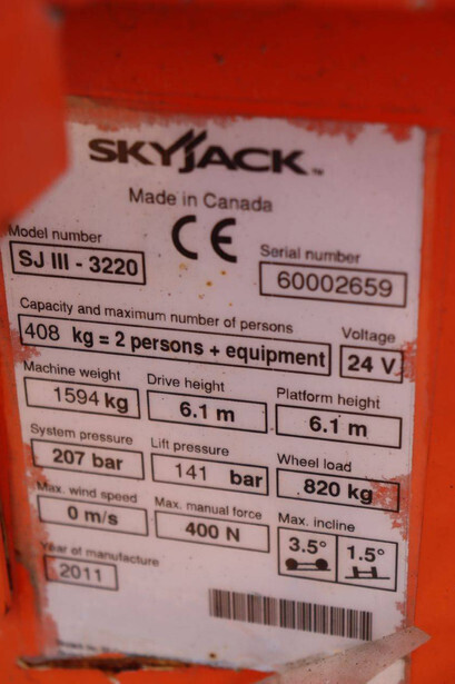 Brand: Skyjack Type: SJ-3220 Serial number: 60002659 Year of construction: 2011 Fuel: Electric Lifting capacity: 408 kg Working height: 8.1 m Reading operating hours: 360 h Machine weight: 1594 kg Chassis: Wheels Type: Scissor lift Tires: Non-marking tires Color: orange