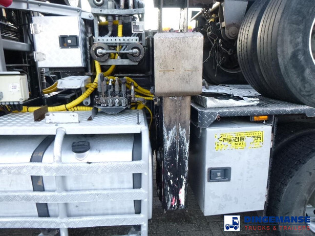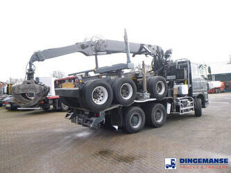 TRUCK // Manual gearbox, Full steel suspension, Retarder, Low roof cabin, Air conditioning, Night heater, 1 Bed, Cool box, Digital tacho // CRANE // Loglift F281S83 loading crane for timber, 1 Hydraulic extension, Max. horizontal reach 8.25 m, Max. lifting capacities: 3280 kg at 8 m, 3780 kg at 7 m, 4420 kg at 6 m, 5220 kg at 5 m, 6380 kg at 4 m, Hultdins log grapple with rotator, 2 Support legs, Year of manufacture 2011 // DOLLY // Friederich 3-axle dolly, Full steel suspension, Disc brakes, BPW Eco Plus axles, Alloy wheels, Tyres 315/80R22.5, Platform height 120 cm, Max. gross weight 34000 kg, Payload 29000 kg, Dimensions 470x250x180 cm // Total vehicle dimensions with dolly loaded on top: 910x255x420 cm