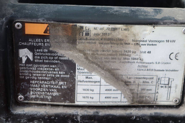Brand: Hyster Type: J2.0XNT Serial number: K160804224K Year of construction: 2012 Fuel: Electric Mast type: Triplex Sideshift: Yes Lifting capacity: 2000 kg Lifting height: 4900 mm Operating hours read: 11699 h Machine weight: 3490 kg Tires: Solid tires Color: red