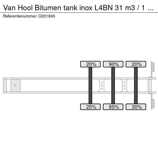 Insulated stainless steel bitumen tank, Capacity 31000 liters, 1 Compartment, Test pressure 4.0 bar, Max working pressure 2.6 bar, Tank material code 14301 EN 10028-7, Air suspension, SAF Axles, Alloy wheels, ABS, Disc brakes, Shipment dimensions 1175x250x360 cm