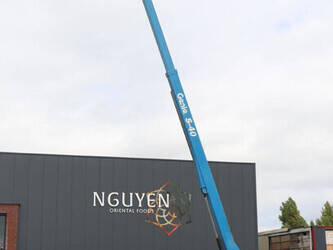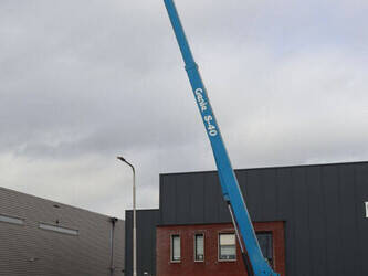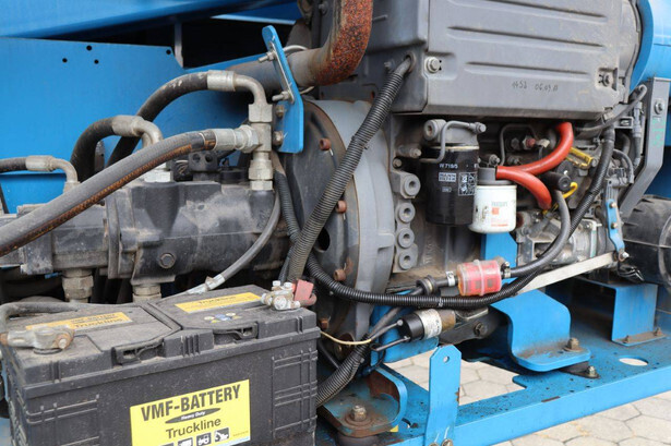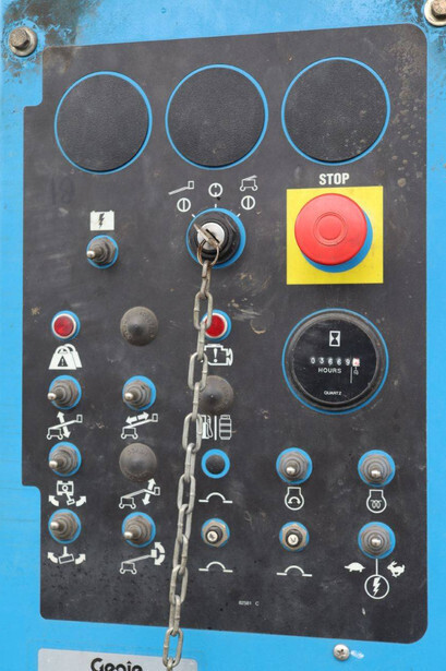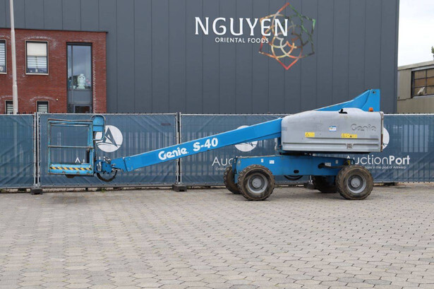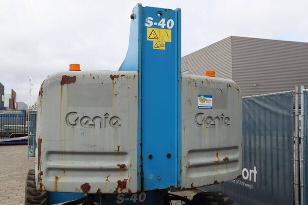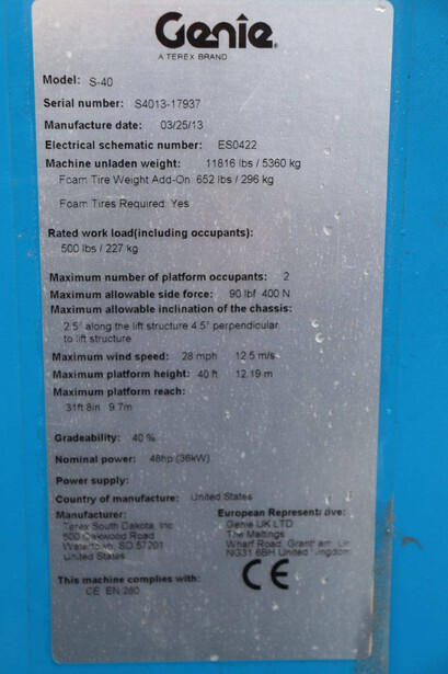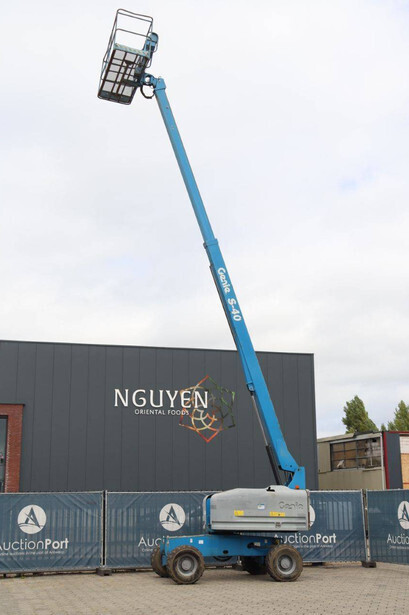 Brand: Genie Type: S-40 Serial number: S4013-17937 Year of construction: 2013 Fuel: Diesel Lifting capacity: 227 kg Working height: 13.87 m Operating hours read: 3669 h Machine weight: 5360 kg Chassis: Wheels Type: Telescopic boom lift Tires: Pneumatic tires Color: blue