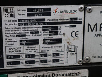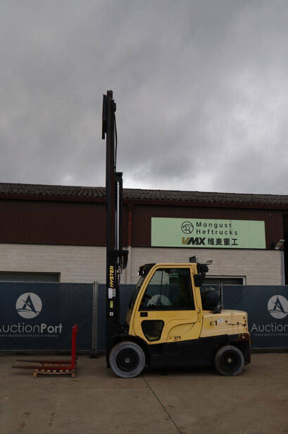Brand: Hyster Type: H5.5FT Serial number: R005B03007L Year of construction: 2013 Fuel: LPG Mast type: Triplex Sideshift: No Lifting capacity: 3750 kg Lifting height: 5240 mm Machine weight: 8800 kg Tires: Solid tires Color: yellow