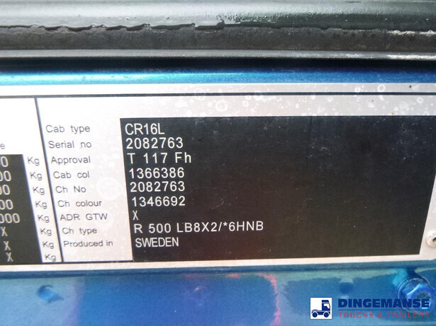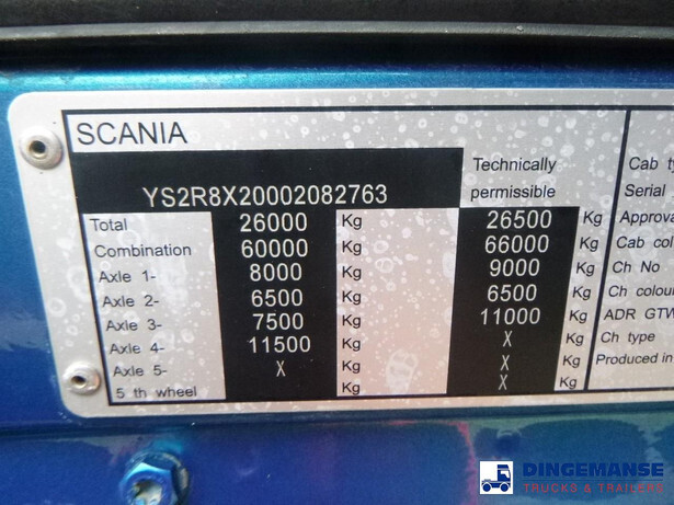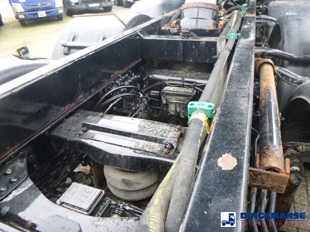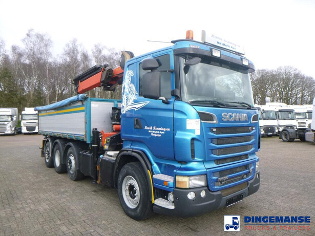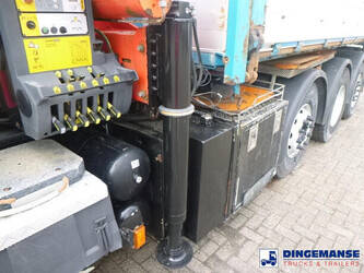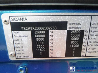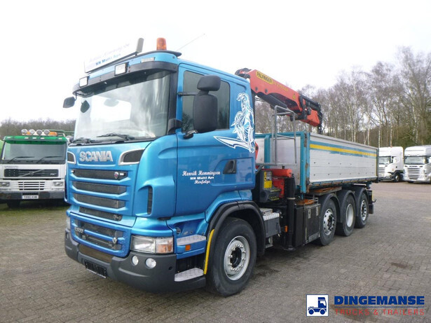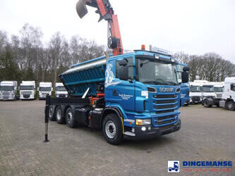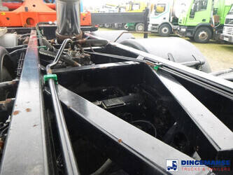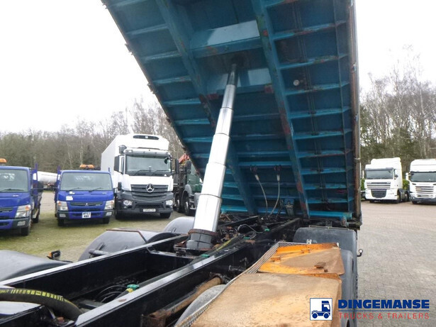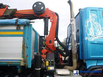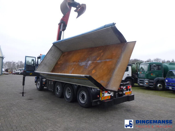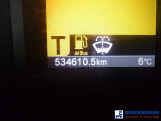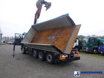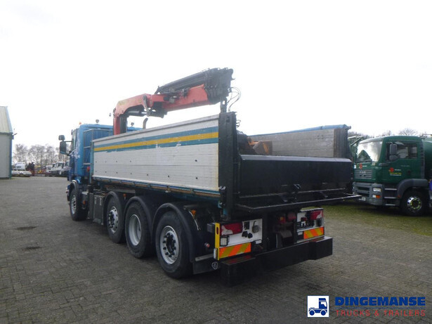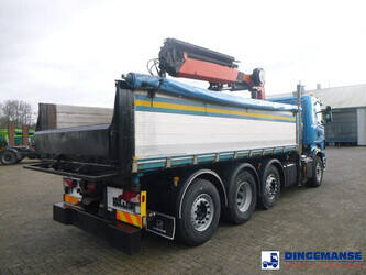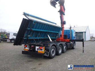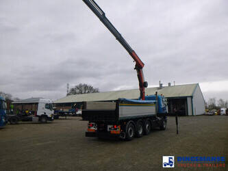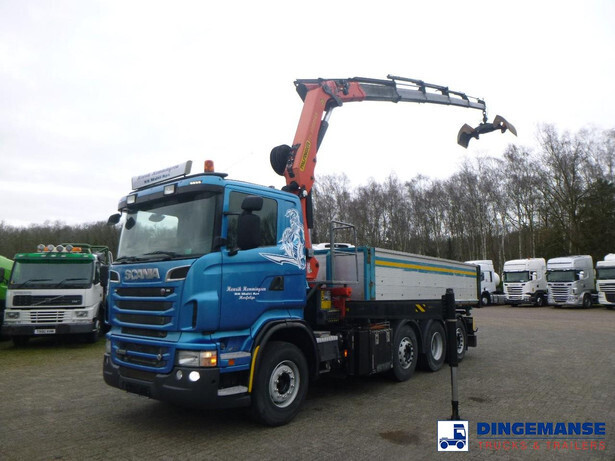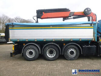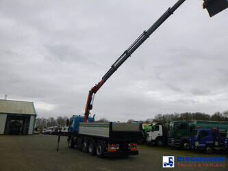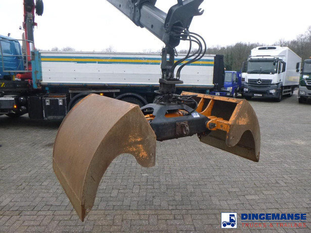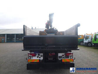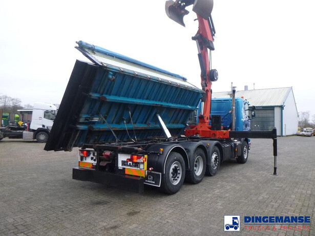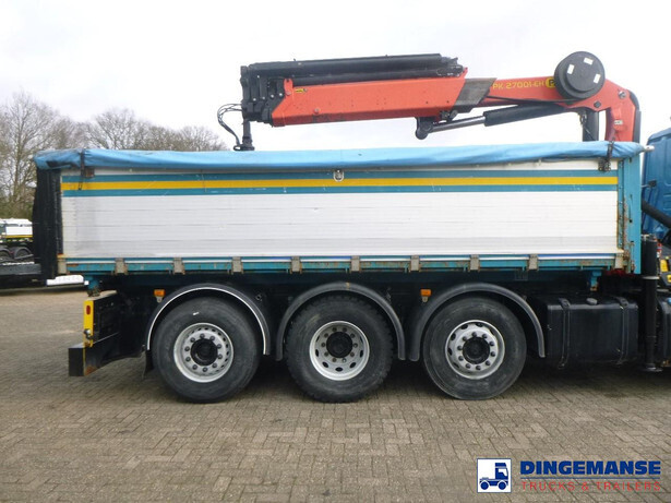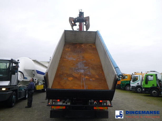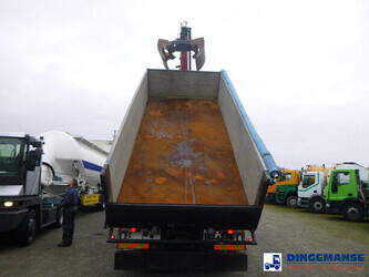 Palfinger PK 27001-EHD loading crane with grapple and rotator, 5 Hydraulic extensions, 2 support legs, Max loading capacity 5500 kg at 4.4m, 3600 kg at 6.3m, 2600 kg at 8.2m, 2000 kg at 10.3 m, 1600 kg at 12.4 m, 1340 kg at 14.5m // Jøni steel back and side tipper, Box dimensions: 600x250x110 cm, Bulk capacity aprox 16.5 m3 // Truck 8x2, Adblue, Euro 5, Automatic gearbox, Full air suspension, 2nd and 4th axle steering axles, 2th axle lifting axle, Hitch, Day cabin, Airconditioning, Digital tachograph, Shipment dimensions: 970x255x365 cm