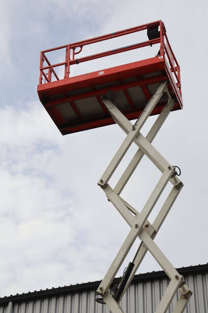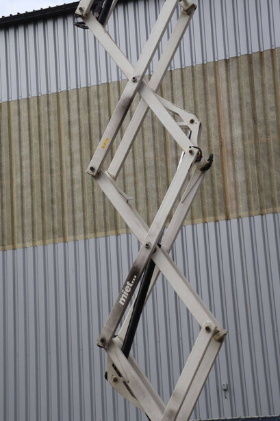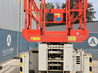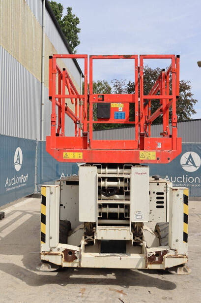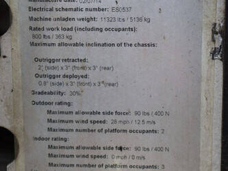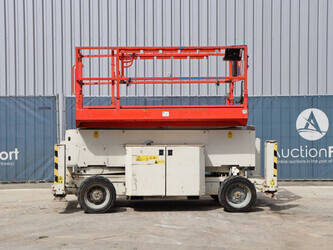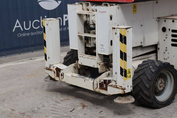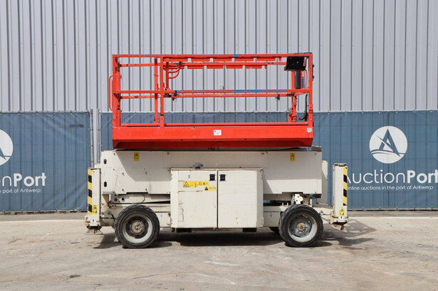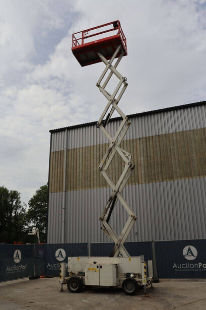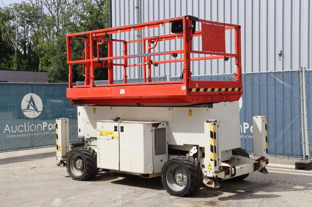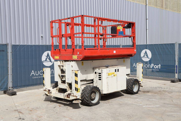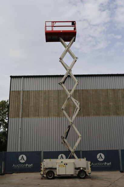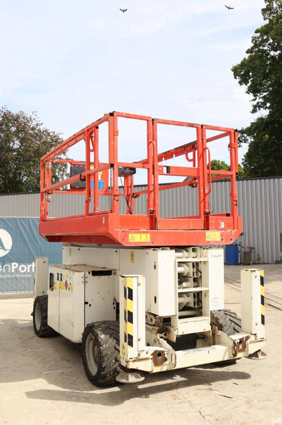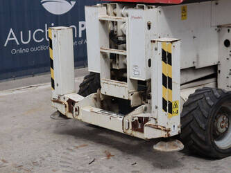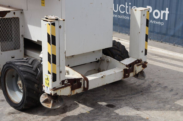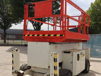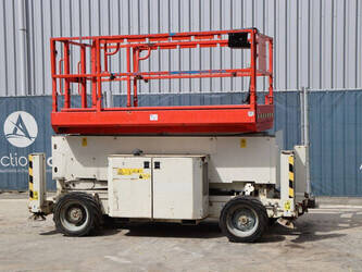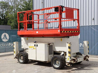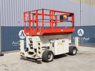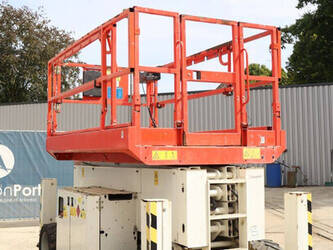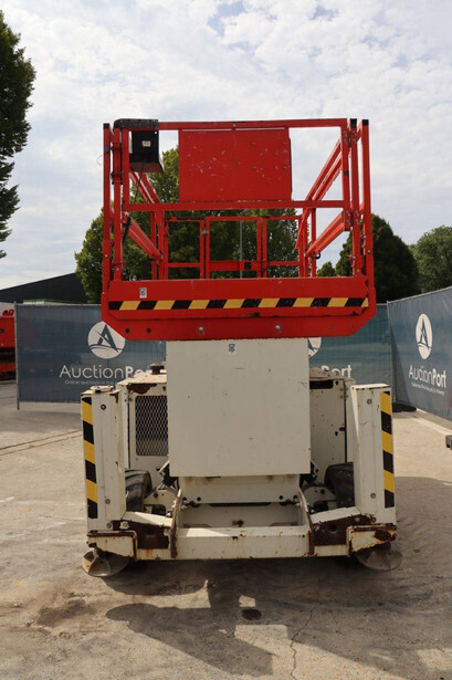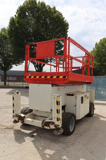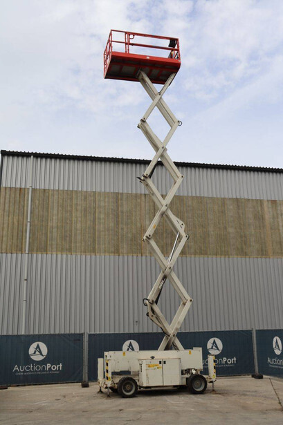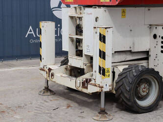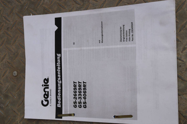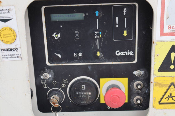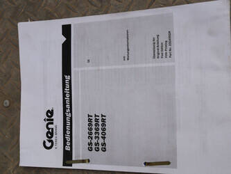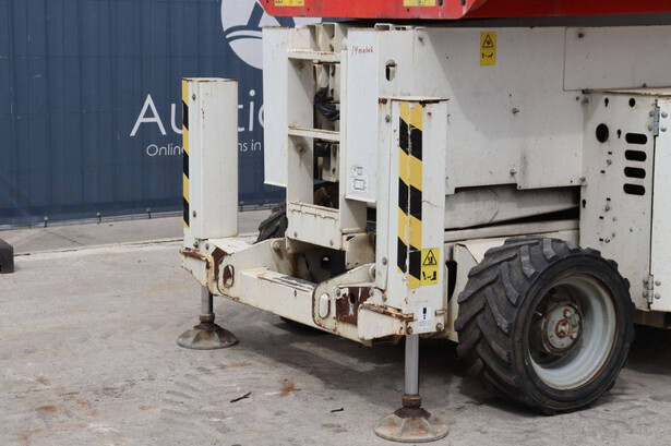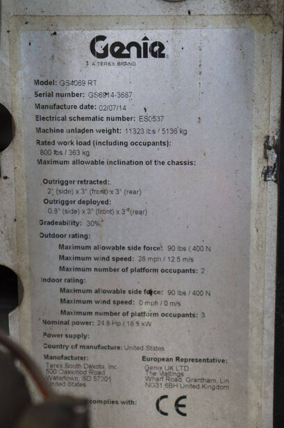 Brand: Genie Type: GS4069 RT Serial number: GS6914-3687 Year of construction: 2014 Fuel: Diesel Lifting capacity: 363 kg Working height: 14.3 m Operating hours read: 1800 h Machine weight: 5136 kg Chassis: Wheels Type: Scissor lift Tires: Pneumatic tires Color: white