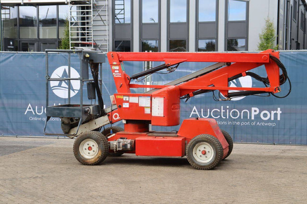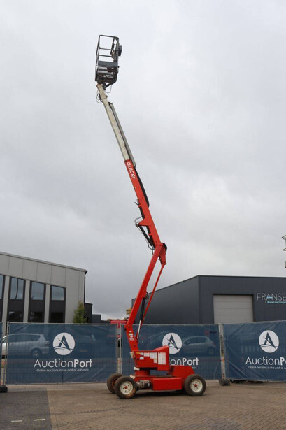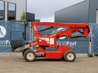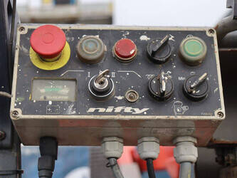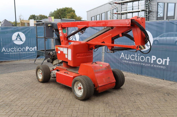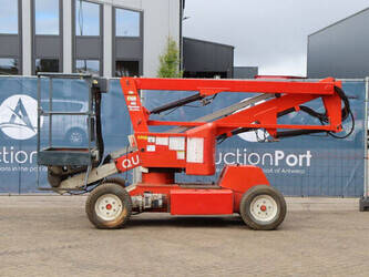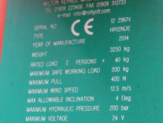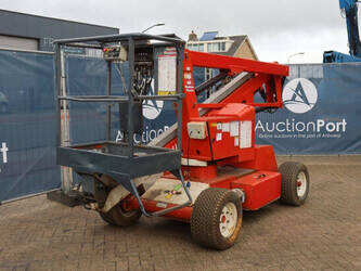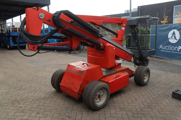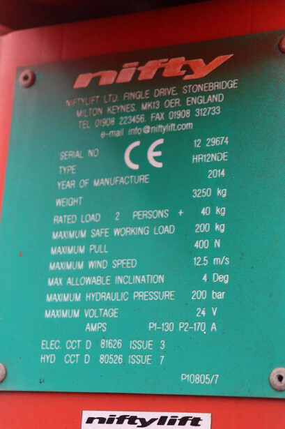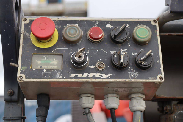 Brand: Nifty Type: HR12NDE Serial number: 12 29674 Year of construction: 2014 Fuel: Electric + Diesel Lifting capacity: 200 kg Working height: 12.2 m Machine weight: 3250 kg Chassis: Wheels Type: Articulated boom lift Tires: Pneumatic tires Color: red