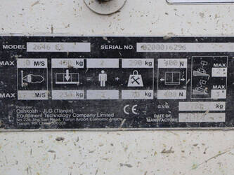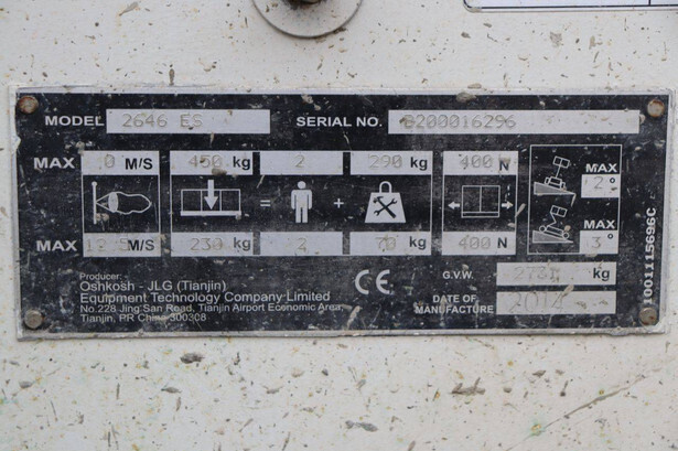Brand: Oshkosh Type: 2646 ES Serial number: B200016296 Year of construction: 2014 Fuel: Electric Lifting capacity: 450 kg Working height: 9.92 m Operating hours read: 572 h Machine weight: 2730 kg Chassis: Wheels Type: Scissor lift Tires: Non-marking tires Color: orange
