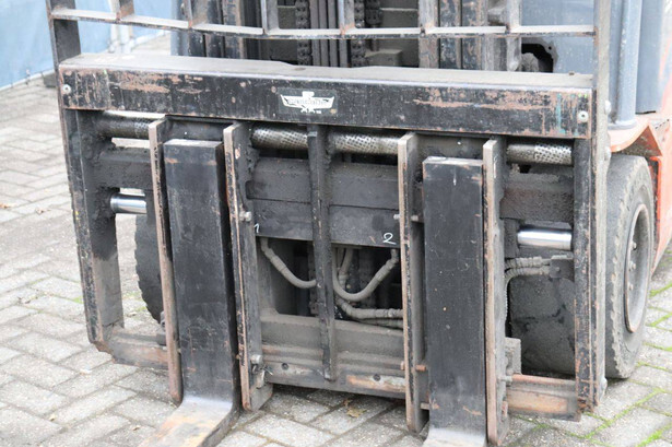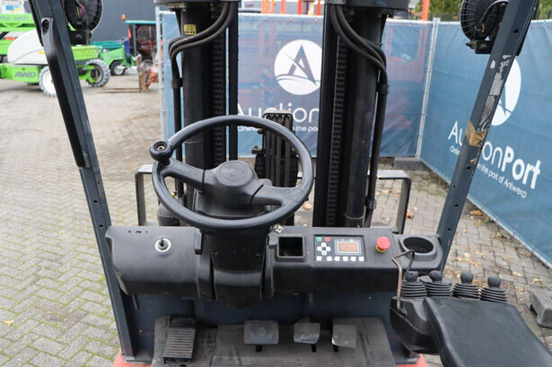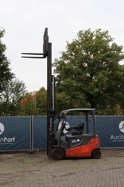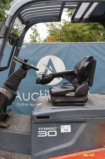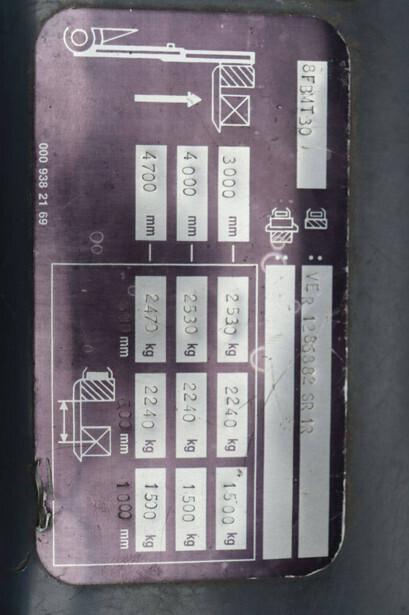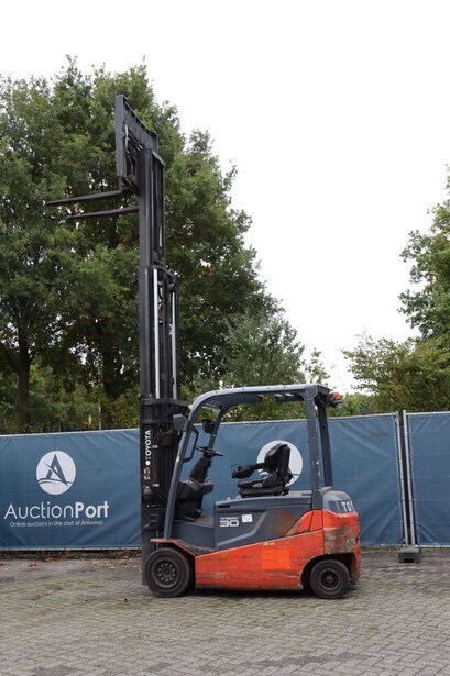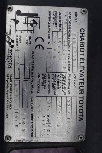 Brand: Toyota Type: 8FBMT30 Serial number: VER1286882SR1R Year of construction: 2014 Fuel: Electric Mast type: Triplex Sideshift: Yes Lifting capacity: 3000 kg Lifting height: 4700 mm Operating hours read: 22773 h Machine weight: 5161 kg Tires: Solid tires Color: red