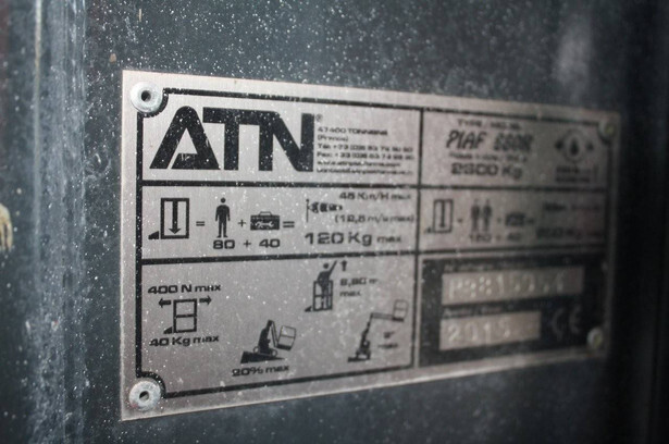 Brand: ATN Type: Piaf 880R Serial number: 8815054 Year of construction: 2015 Fuel: Electric Lifting capacity: 200 kg Working height: 8.8 m Operating hours read: 881 h Machine weight: 2300 kg Chassis: Wheels Type: Mast lift Tires: Solid tires Color: red