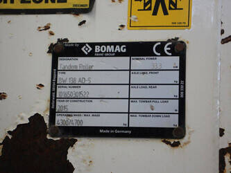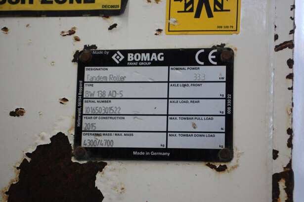 Brand: Bomag Type: BW138 AD Serial number: 101650301522 Year of construction: 2015 Fuel: Diesel Engine power: 33.0 kW Reading operating hours: 820 h Machine weight: 4700 kg Color: white
