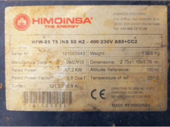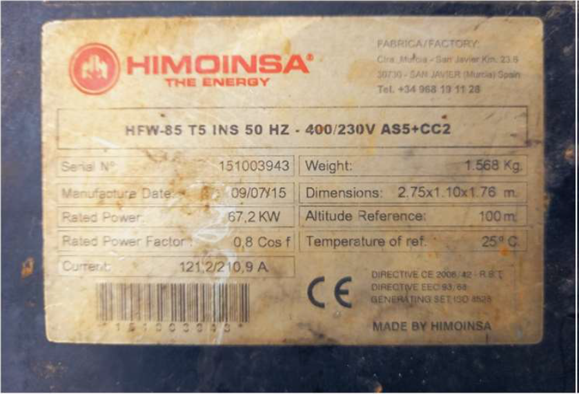 2015, "HIMOINSA", GENERATOR, MOD. HFW-85-T5.INS-50 HZ, SERIAL NR 151003943, 12.339 HRS. - NO DUTTIES TO BE PAID BY BUYER