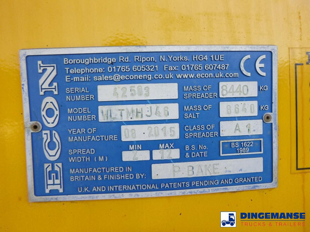 RIGHT-HAND DRIVE, NON-EU VEHICLE, REQUIRES CUSTOMS CLEARANCE // Econ WLTMHJ 46 salt spreading system, Dry salt capacity 8640 kg, Year of construction, 2015, Spread width minimal 2 meters, maximal 12 meters, Econ WSPDTD28 snow plough, Control display in cabin // Truck 4x4, Euro 6, AdBlue. Automatic gearbox, Diff. Lock, Full steel suspension, Day cabin, Airconditioning, RIGHT-HAND-DRIVE, Digital tachograph Shipment dimensions 790x255x340 cm ( without plough) 1000x255x340 cm (with plough).