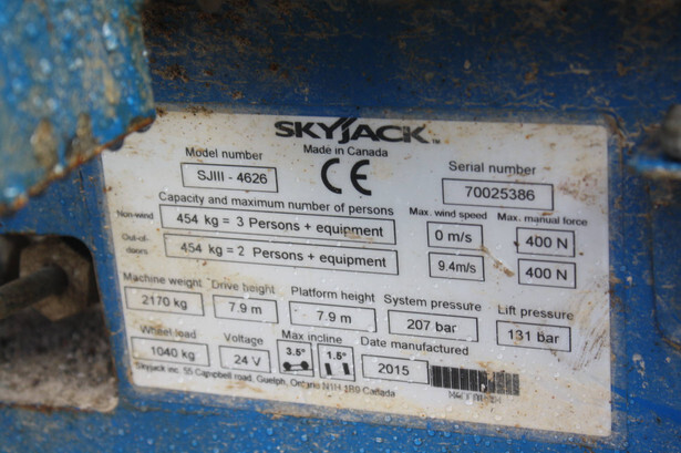 Brand: Skyjack Type: SJ4626 Serial number: 70025386 Year of construction: 2015 Fuel: Electric Lifting capacity: 454 kg Working height: 10 m Operating hours read: 253 h Machine weight: 2170 kg Chassis: Wheels Type: Scissor lift Tires: Non-marking tires Color: blue