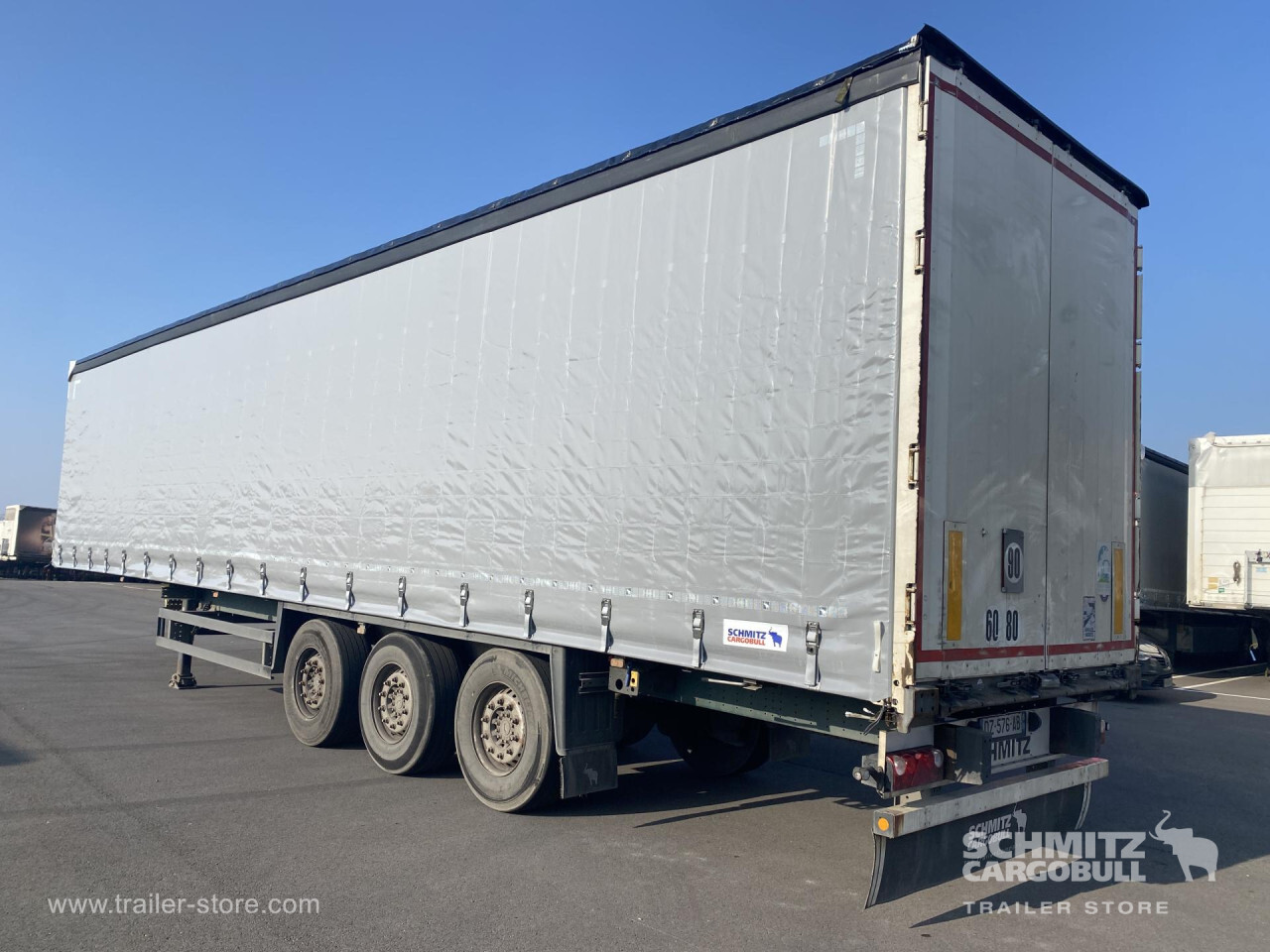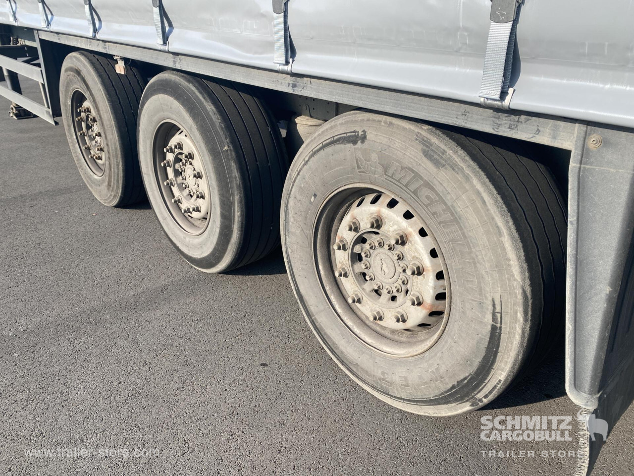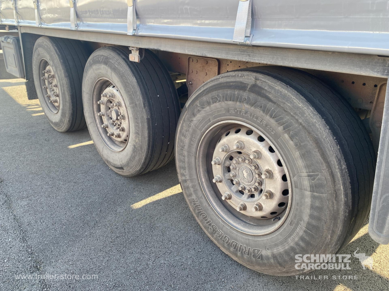 Remarks: **Safety**\\Rear underrun, Antilock Braking System ABS, Fire extinguisher holder, Hubodometer\\\\**Exterior**\\Air suspension, Toolbox, Bolted chassis, Sliding roof, 1x15 and 2x7 pin plug, Antispray\\\\**Cargo securing**\\Cargo securing with certificate, DIN EN 12642 (code XL) certificate, Punched load securing side rave, Wooden - support slats\\\\**Brake system**\\Disc brake, Schmitz ROTOS\\\\**Floor**\\Wooden floor, Lashing rings in floor\\\\**Loading area**\\Length 13.620 mm, Width 2.480 mm, Height 2.780 mm, Volume 91 m³\\\\**Tyre sizes**\\1. Achse: 385/65 R22.5 , Tread depth: 4 mm / 8 mm, 2. Achse: 385/65 R22.5 , Tread depth: 7 mm / 7 mm, 3. Achse: 385/65 R22.5 , Tread depth: 4 mm / 4 mm\\\\**Other dimensions and weights**\\Payload: 31.401 kg, GVW: 38.000 kg\\\\----