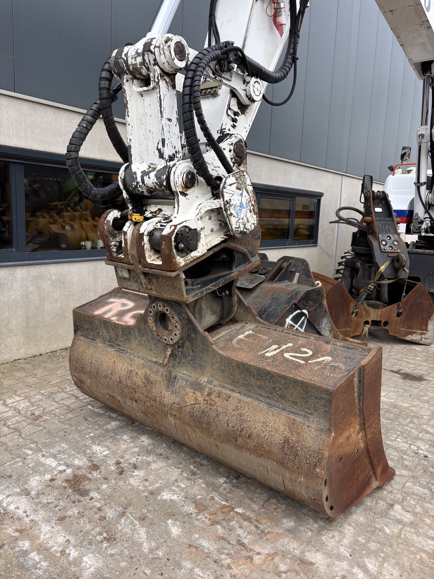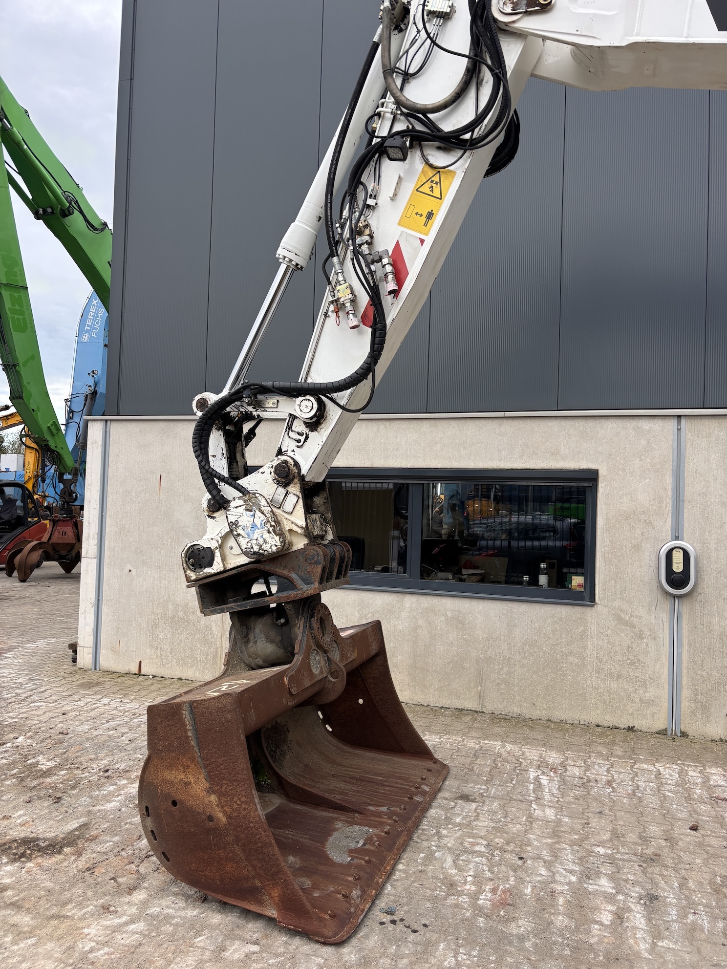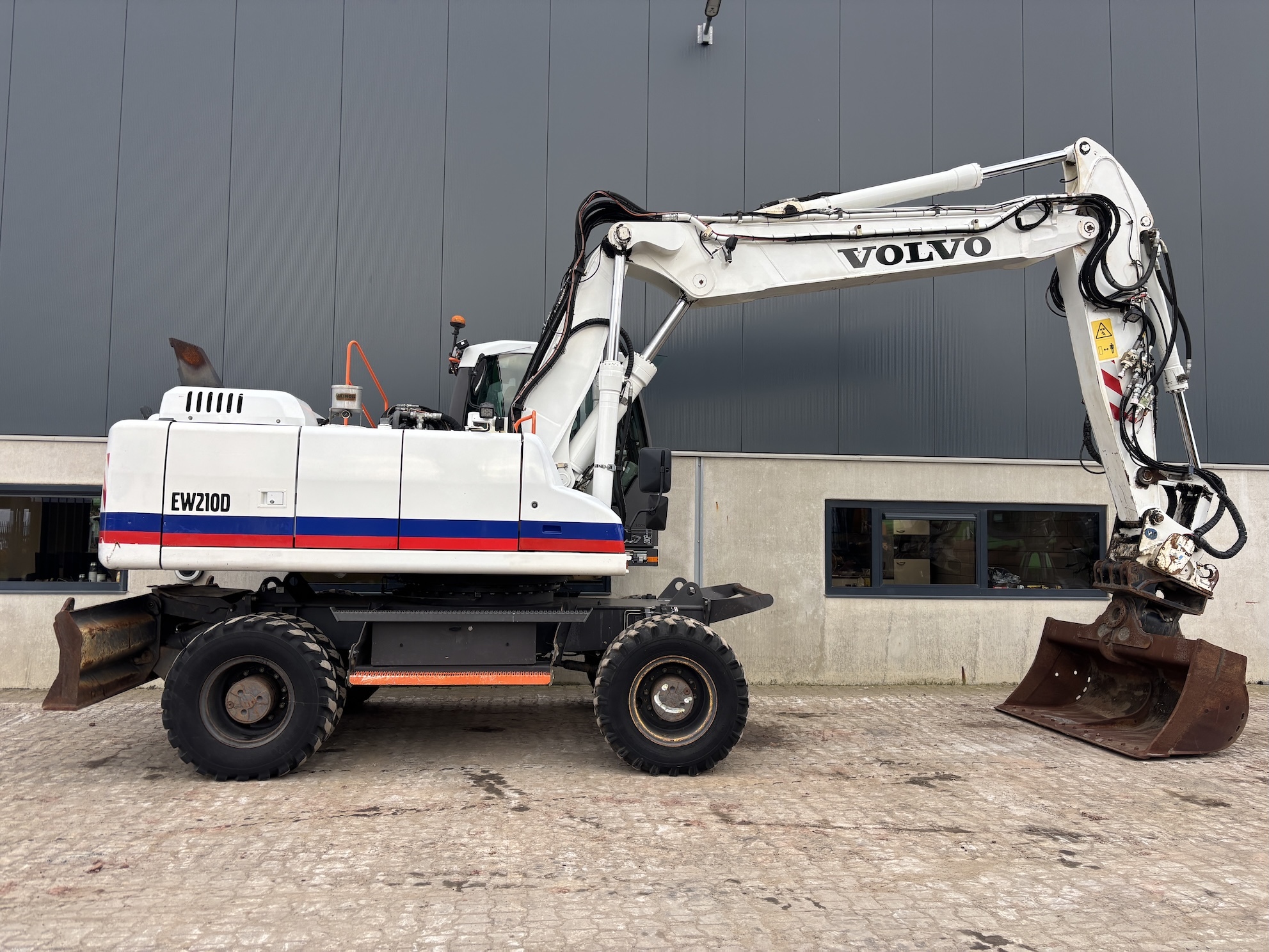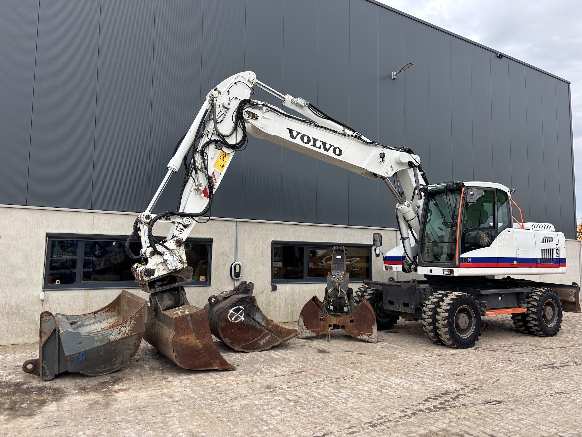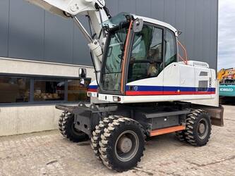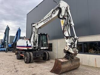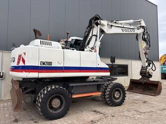 Very complete Volvo EW210D mobile excavator equipped with a Volvo D6H 6 cilinder water cooled diesel engine (129kW) with just 10084 working hours on the service meter. All thinkable hydraulics, automatic hydraulic Wimmer quick hitch which changes hydraulic attachments automatically, 160cm 1.1m3 grading bucket, hydraulic tilting bucket, 1.1m3 digging bucket, automatic changeable clamshell bucket, dozer blade, additional work lights, additional books, rear and side view camera, central lubrication, airco, radio etc..Really nice & complete machine from first owner. Well maintained, no faults, runs very smooth. Very expensive quick hitch system attachments which are all in a very good condition. For more information please contact us.
