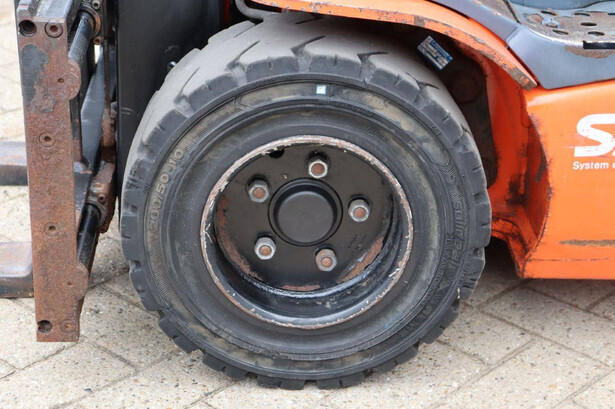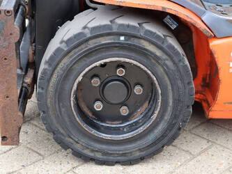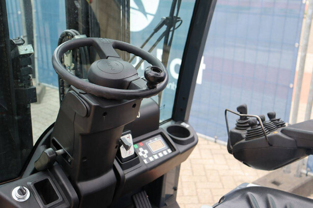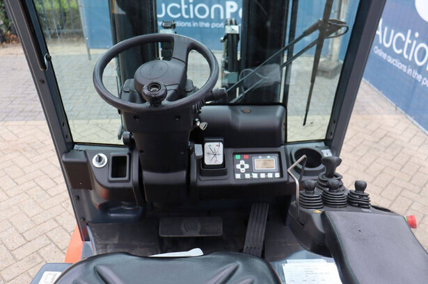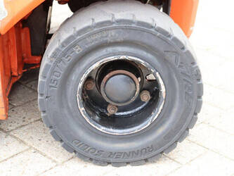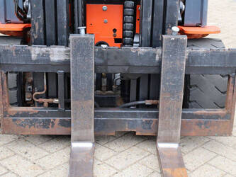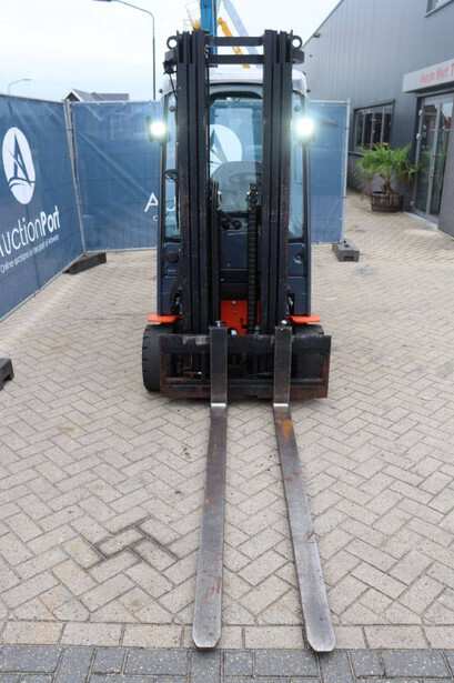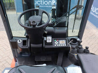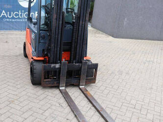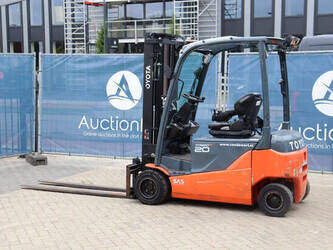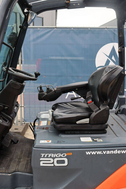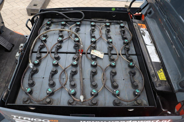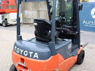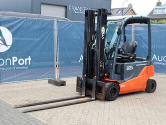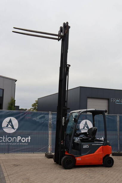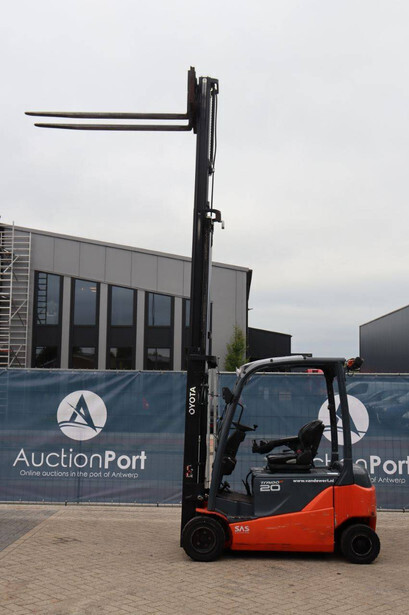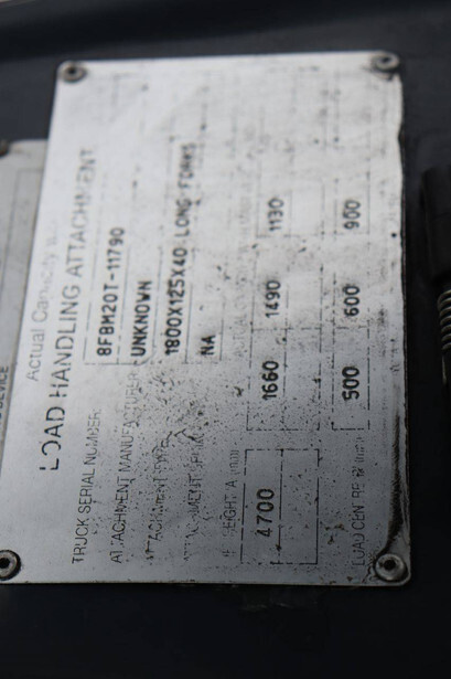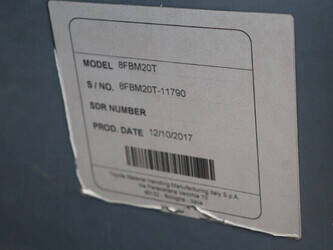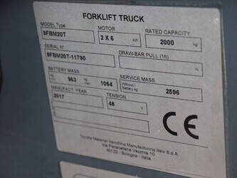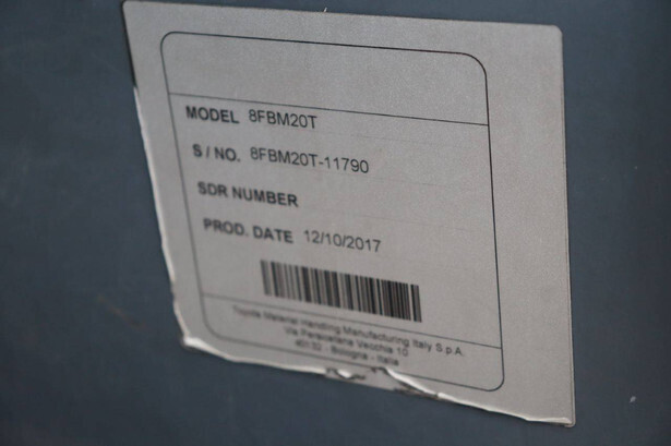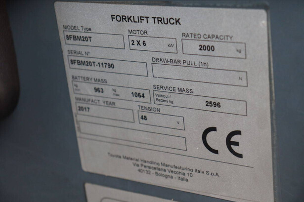 Brand: Toyota Type: 8FBM20T Serial number: 8FBM20T-11790 Year of construction: 2017 Fuel: Electric Mast type: Triplex Sideshift: No Lifting capacity: 2000 kg Lifting height: 4700 mm Operating hours read: 6535 h Machine weight: 3660 kg Tires: Solid tires Color: orange
