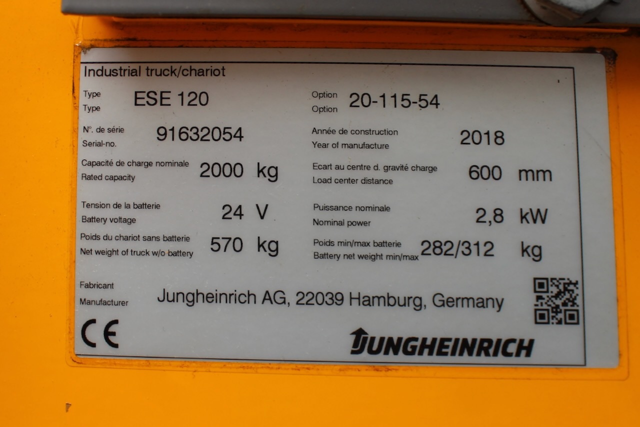 Jungheinrich ESE 120 Load capacity: 2.000 Kg Lifting height: Mast: Fork: 1.150 x 540 mm Build height: Motorization: Electric Battery: NO Charger: 24 v Good condition, Without Battery, New battery optional (24v/375Ah) 1230€. Reference number: 6662